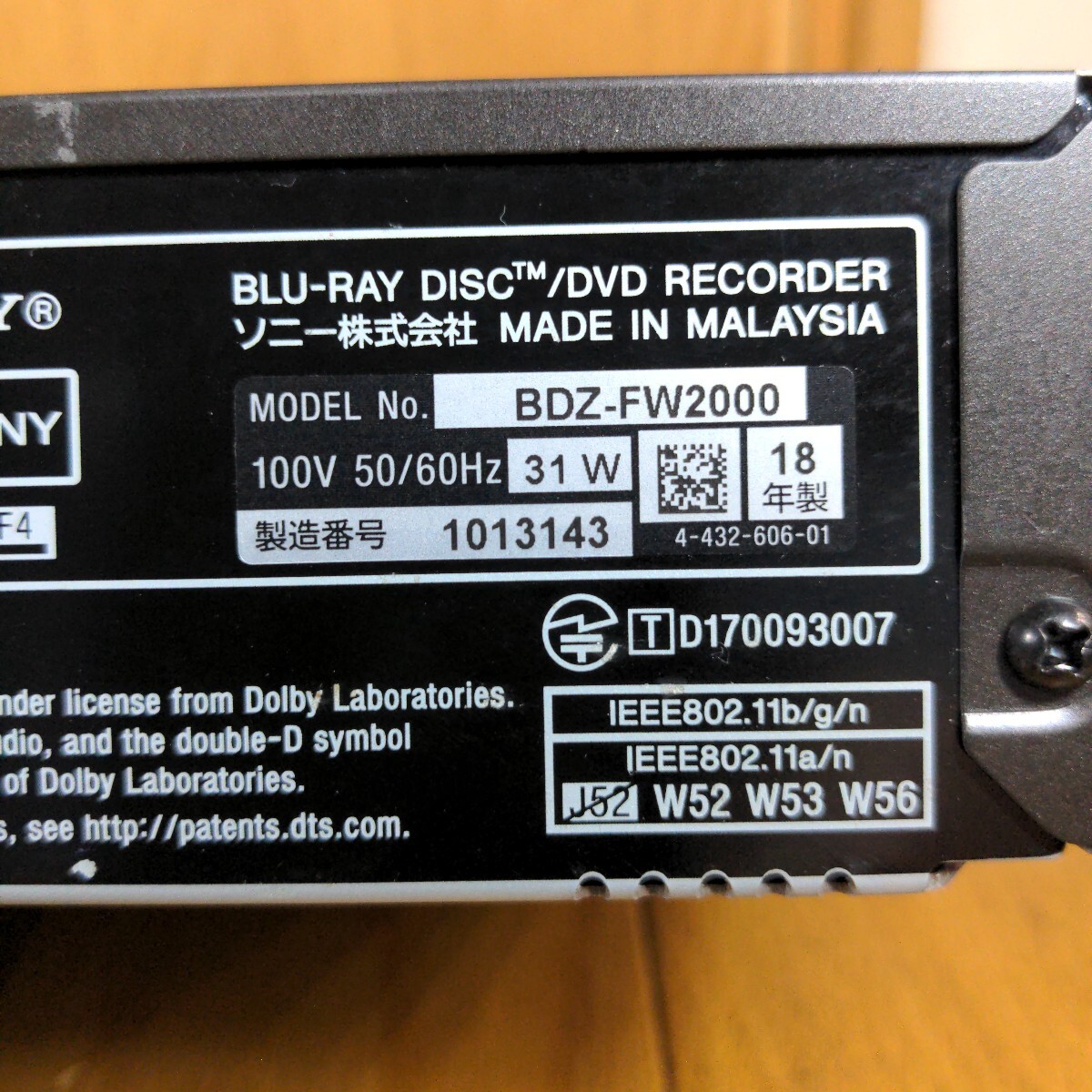 ソニー ブルーレイレコーダー BDZ-FW2000になります。