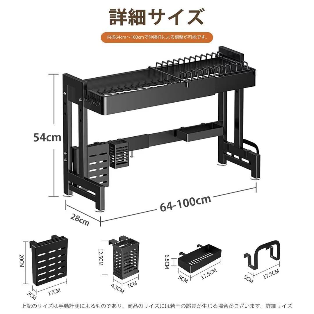 【伸縮式でどんなシンクにも対応】長さ60cm-100cm,高さ54cm(3段階調節可能)、幅28cmに自由調節伸縮水切りラッ。シンク上方のスペースを効率的に利用する水切りラックです。サイズ違いのシンク上にぴったりフィット。シンク上水切りラックとして洗い物の効率化を実現。