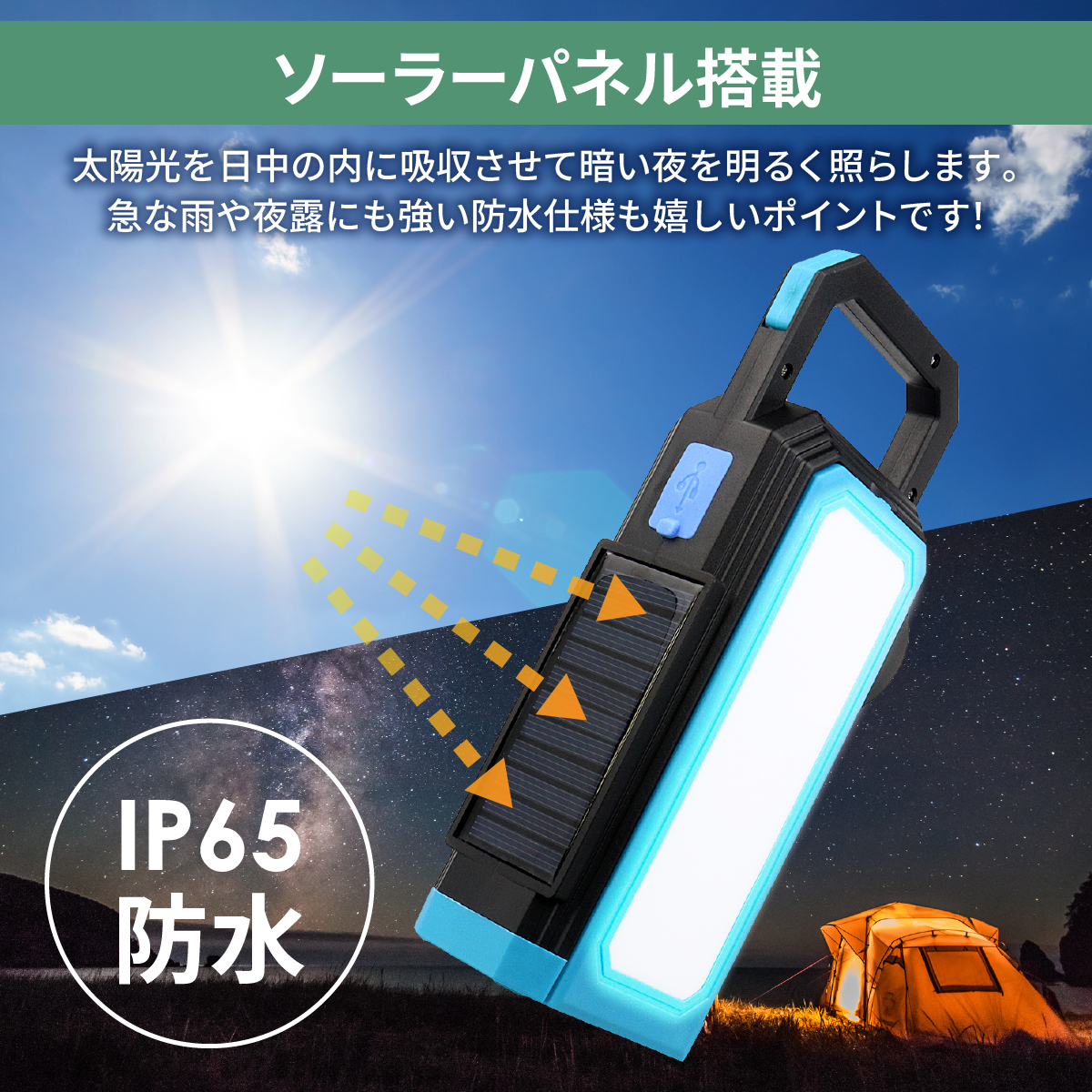 キャンプや夜釣りなどの夜間照明に役立つLEDライトです。照明部分・ソーラーパネル・持ち手全体が防水性に優れているため、どの角度から水が当たってもライトは点灯したまま!