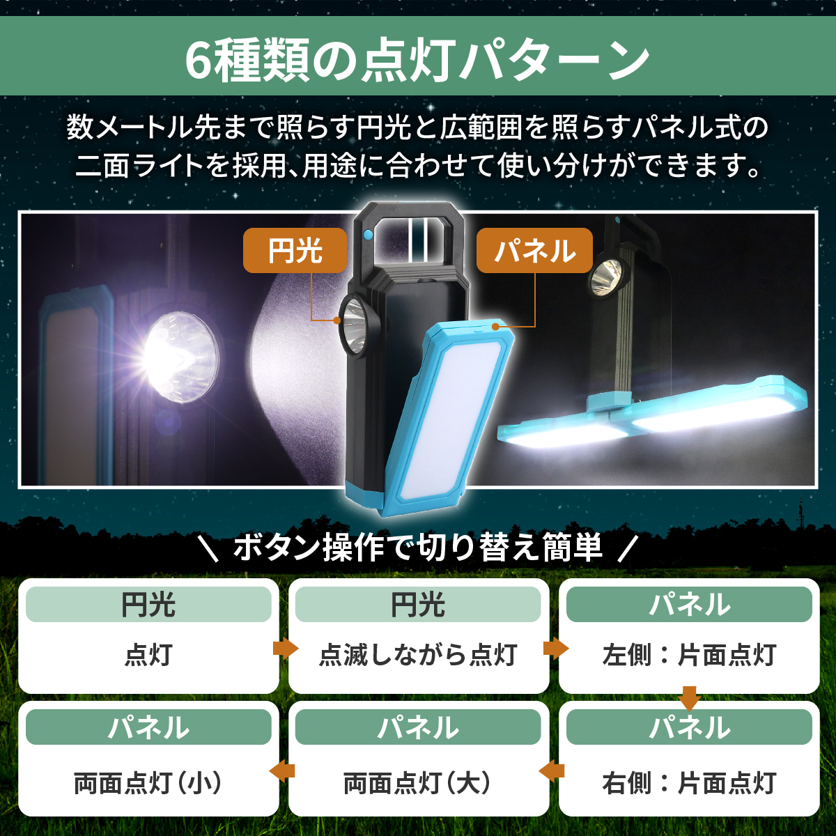 使い方はとても簡単!ボタン1つで全6種類のライトモードを切り替えできるため、老若男女問わずお使いいただけます。左右のパネルはそれぞれ90度ずつ開くのでより広範囲を照らせます。使用後は本体に折り畳むことでコンパクトに収まります。 【点灯方法】■Push1:円形ランプの点灯 ■Push2:円形ランプの点滅 ■Push3:左パネルの単独点灯 ■Push4:右パネルの単独点灯 ■Push5:左右パネルの常時点灯(強) ■Push6:左右パネルの常時点灯(弱)