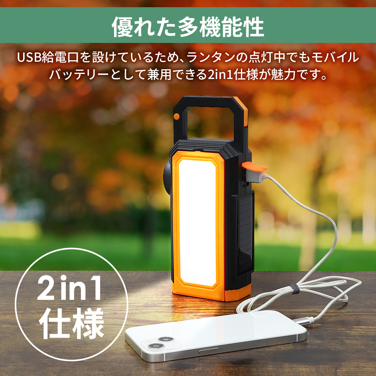 LEDランタン ソーラーパネル付き USB/Type-C給電 IP65防水 高輝度 吊り下げフック  オレンジ/ブルー2個セット