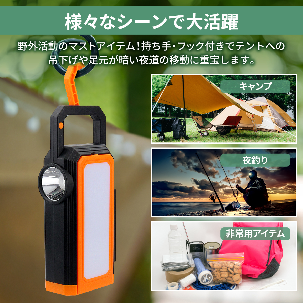 持ち手に内蔵されているフックはランタンフック・木の枝・テントタープなどに引っ掛けて常時吊り下げておけます。頭上にLEDランタンをセットすることで手元を明るく照らしてくれます。アウトドア以外に、車両整備・倉庫照明・工事現場・停電時など様々なシーンで重宝すること間違いなし!いつ発生するか分からない災害時に備えて、一家に一台常備しておくと心強いアイテムです。