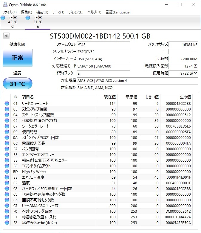 ・当方の環境でCystalDiskInfoを使用し正常判定でした。