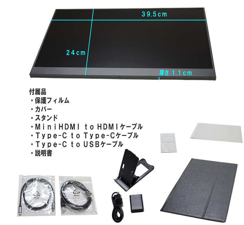 ACアダプター、HDMIケーブル、 電源USBケーブル、 画面フィルム、保護カバー、 スタンド、TYPE-Cケーブル 止めネジ |