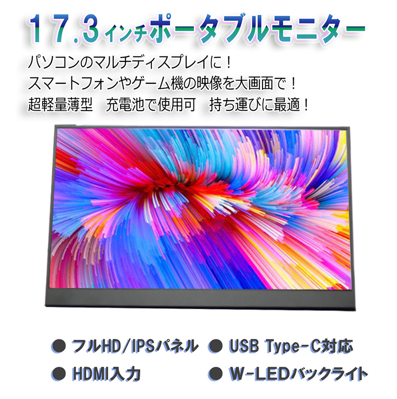 高解像度 フルハイビジョン 17.3インチポータブルモニター 1920x1080 HDMI USB Type C イヤホン端子 スピーカー内蔵 IPS 軽量マルチモニター[1年間保証]