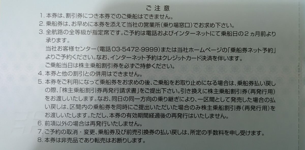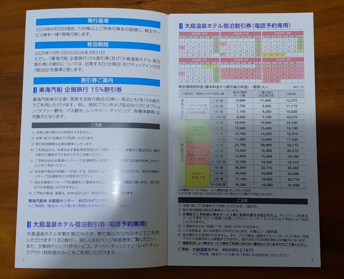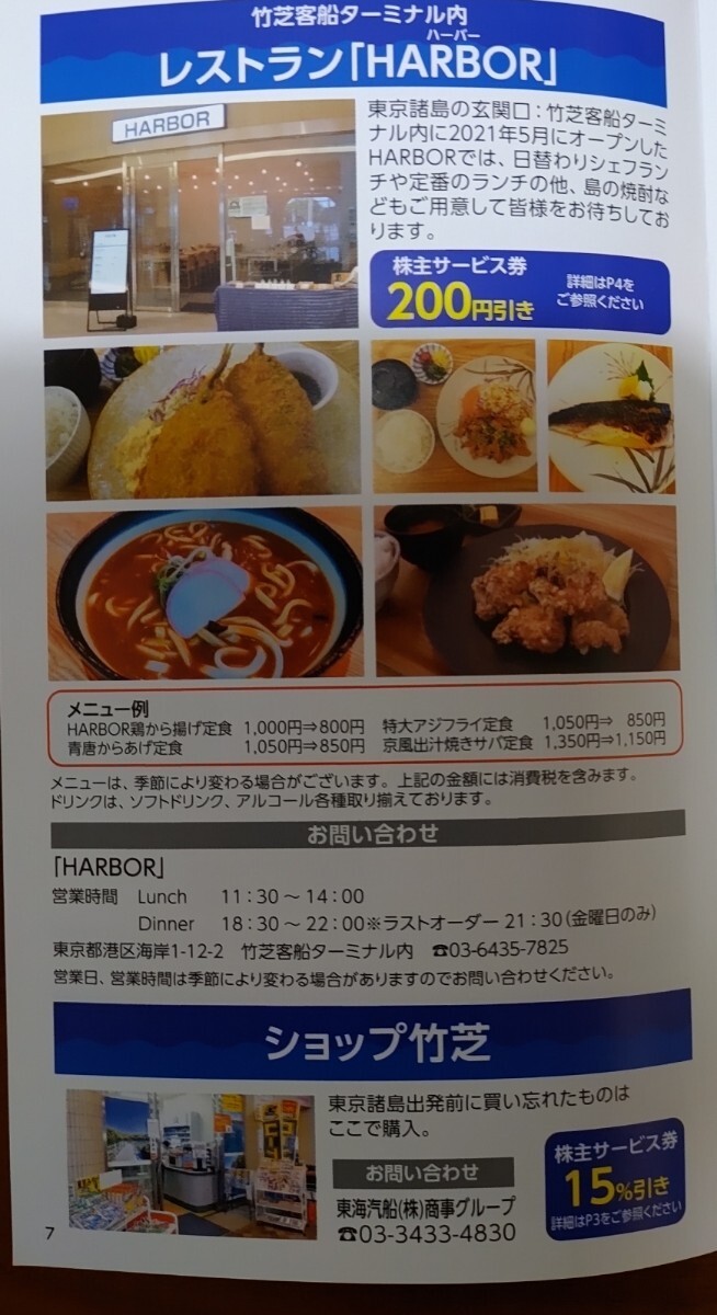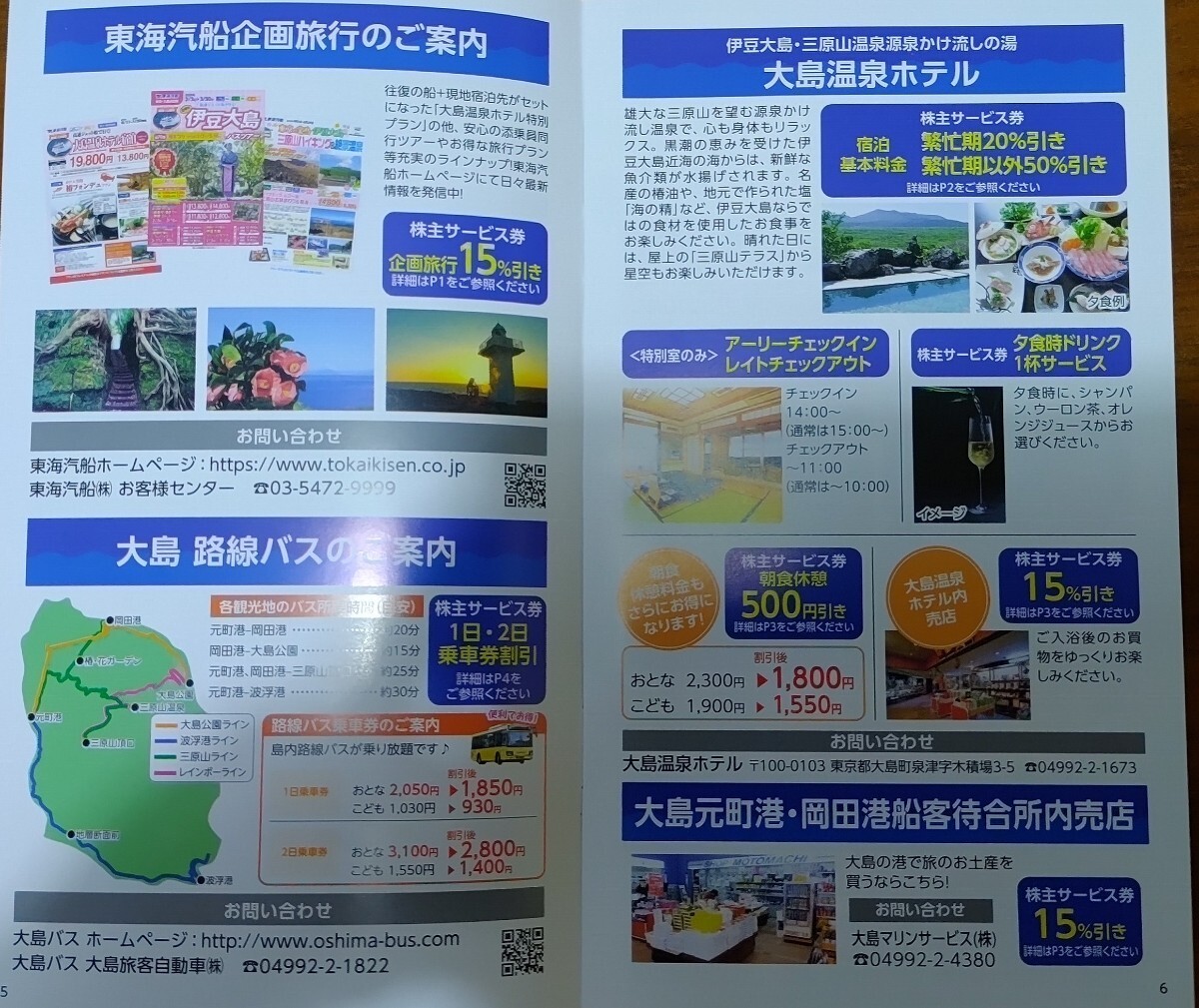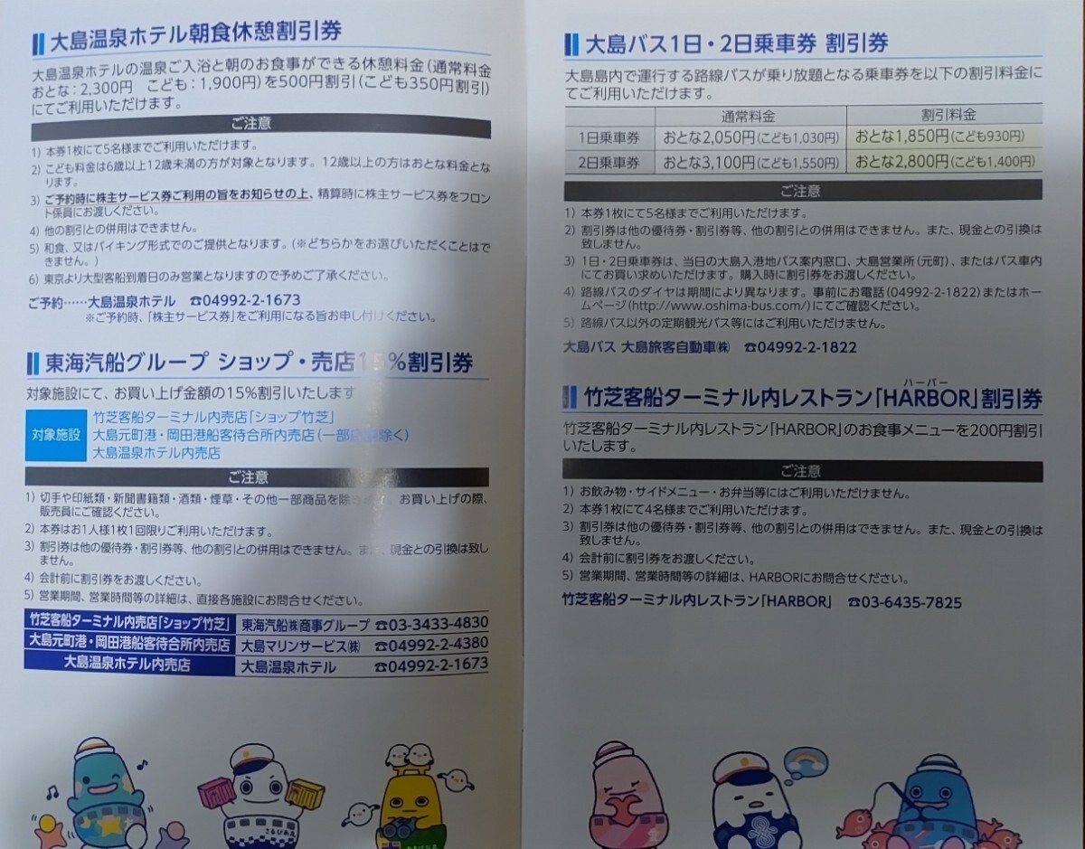 株主サービス券は、東海汽船企画旅行15%割引券、大島温泉宿泊割引券、大島温泉ホテル朝食休憩割引券、東海汽船グループショップ売店15%割引券、大島バス1日2日乗車券割引券、竹芝客船ターミナル内レストラン「HARBOR」割引券の6種類が各5枚です。