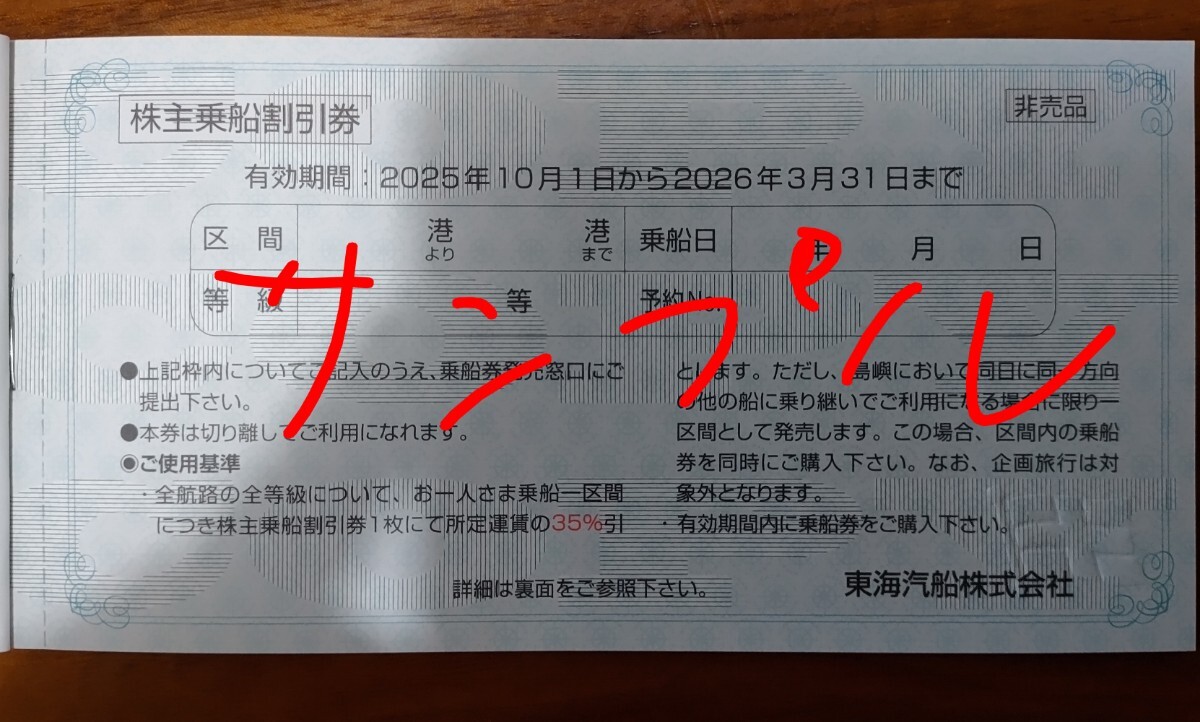 東海汽船の株主乗船割引券1冊と株主サービス券です。いずれも有効期限は2026年3月31日です。