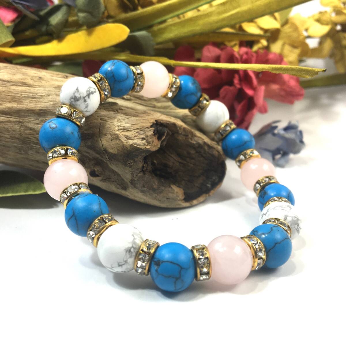こちらは、ローズクォーツとハウライトとターコイズを組み合わせたブレスレットです。間にはロンデルを挟み高級感あるデザインに仕上がっています。石大きさは腕にも馴染みやすいように10mm玉で内径約17cm(伸可能)です。数に限りがございますので気になる方はお早めにどうぞ。サイズ調節も可能ですのでサイズ調節の場合は取引ナビにてご一報くださいませ。(サイズ調節無料です)