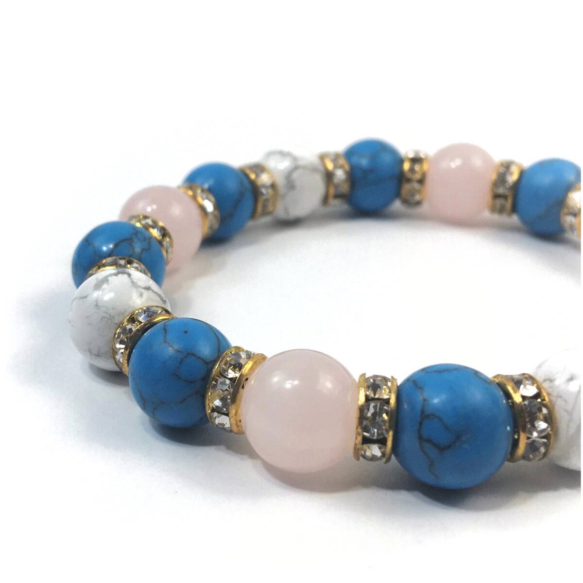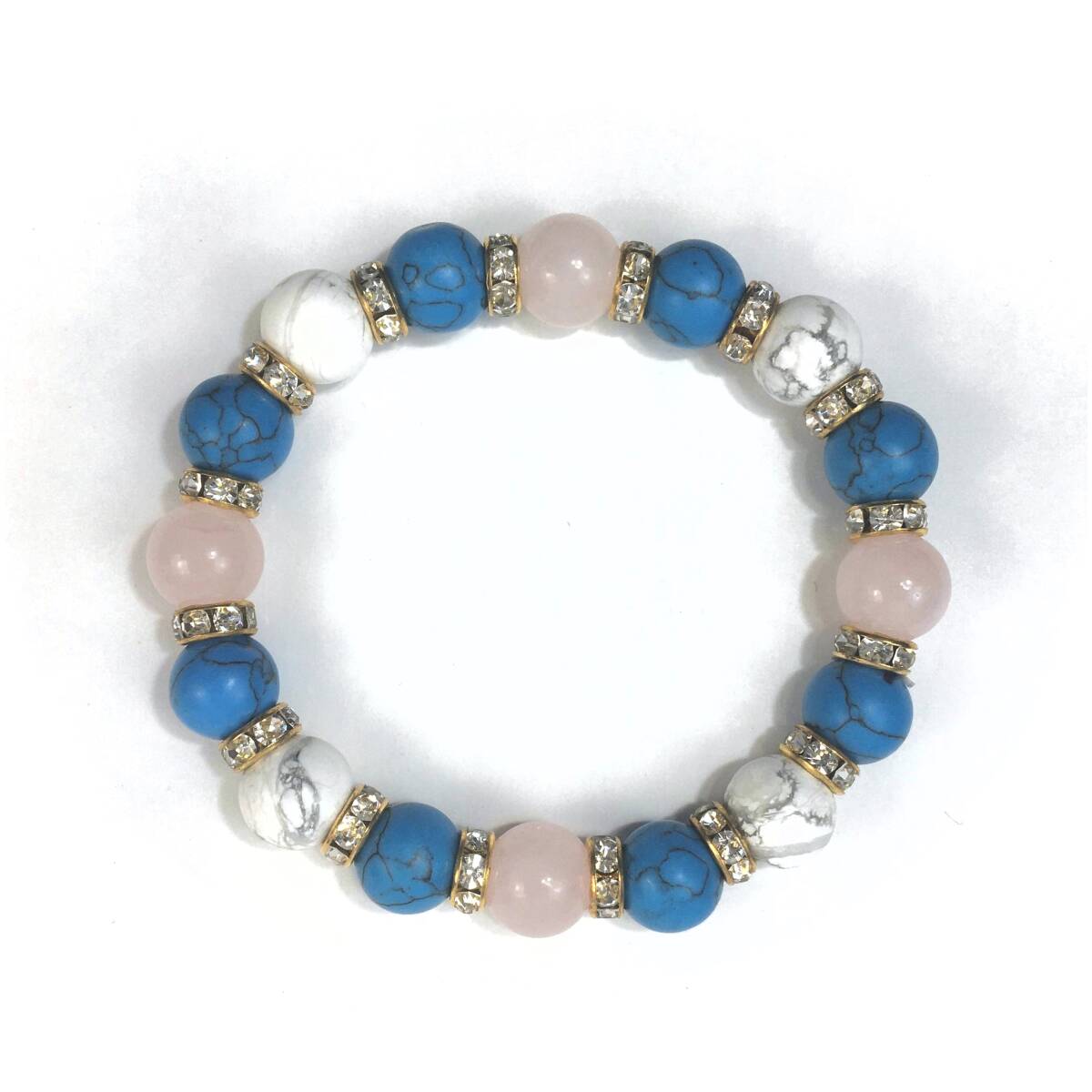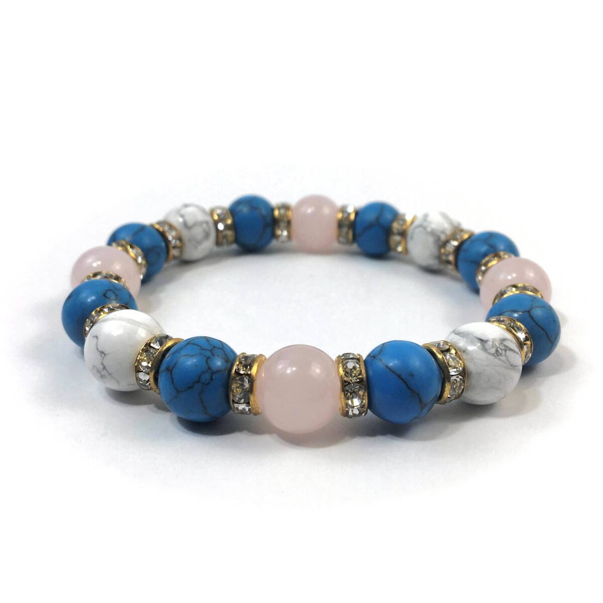 ローズクォーツ×ハウライト×ターコイズ パワーストーン ブレスレット (ロンデル: ゴールド) 10mm メンズ・レディース