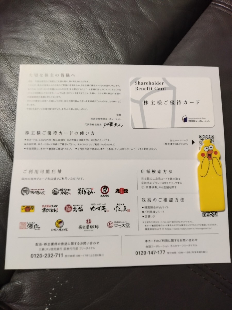 物語コーポレーションの株主優待カード3500円分(使い切り型プリペイドカード)です。