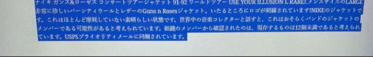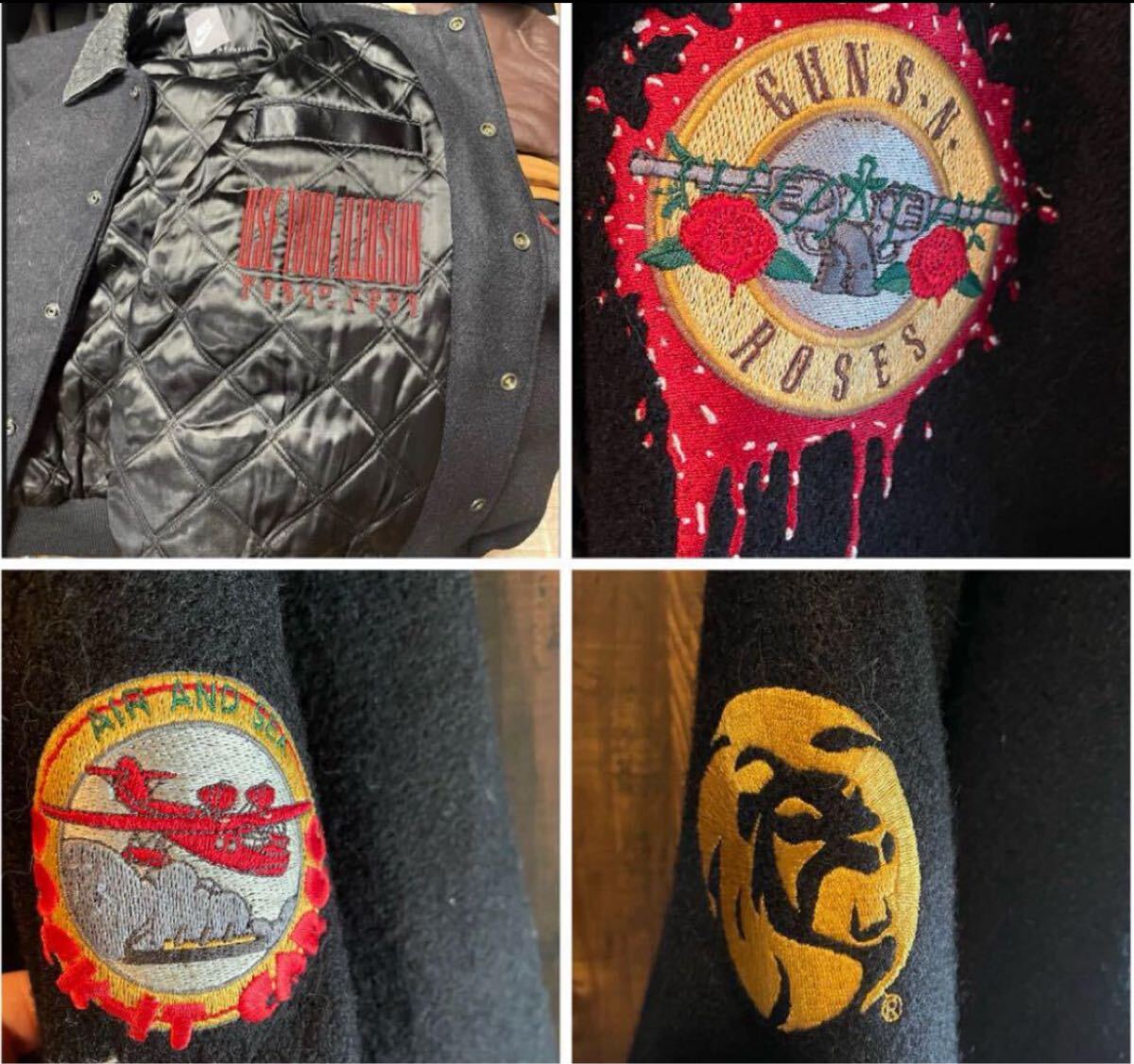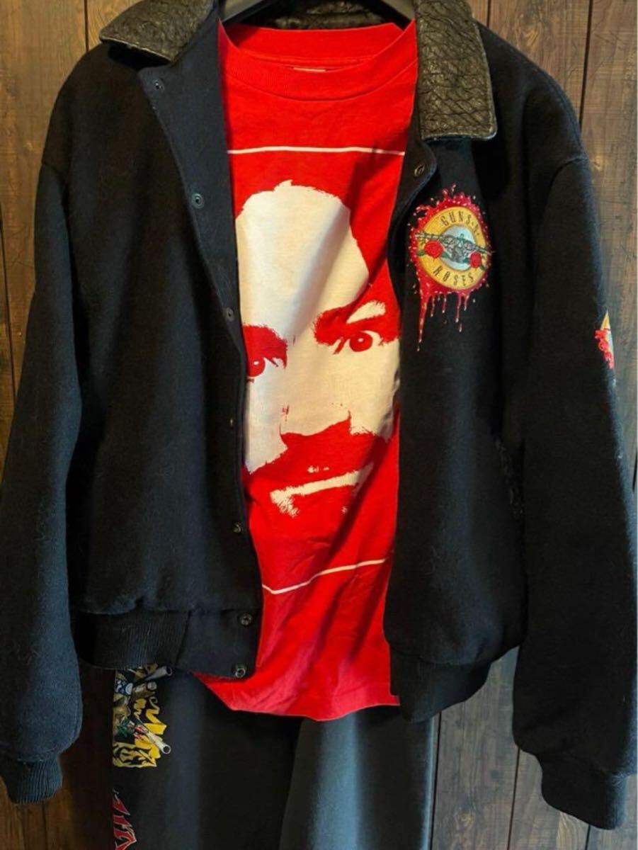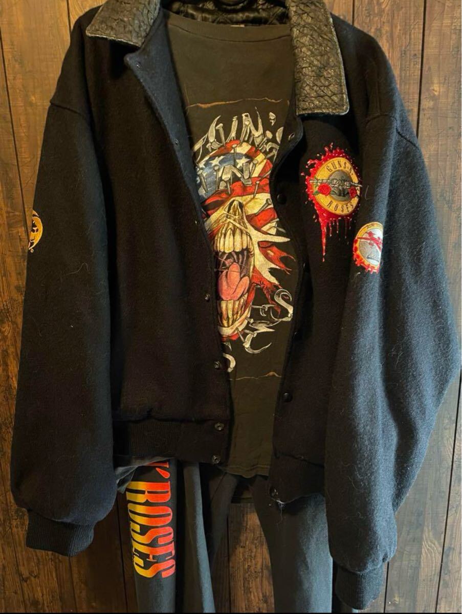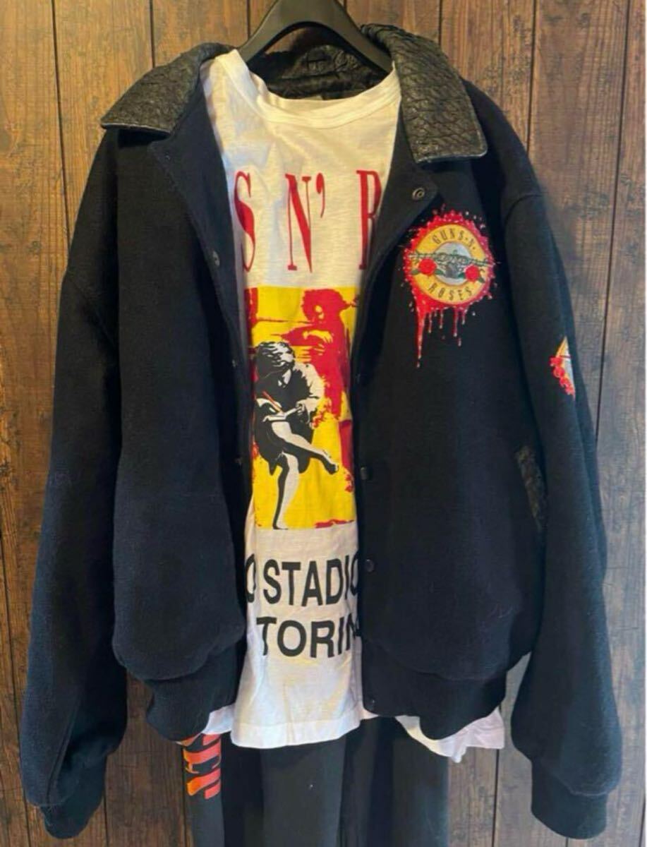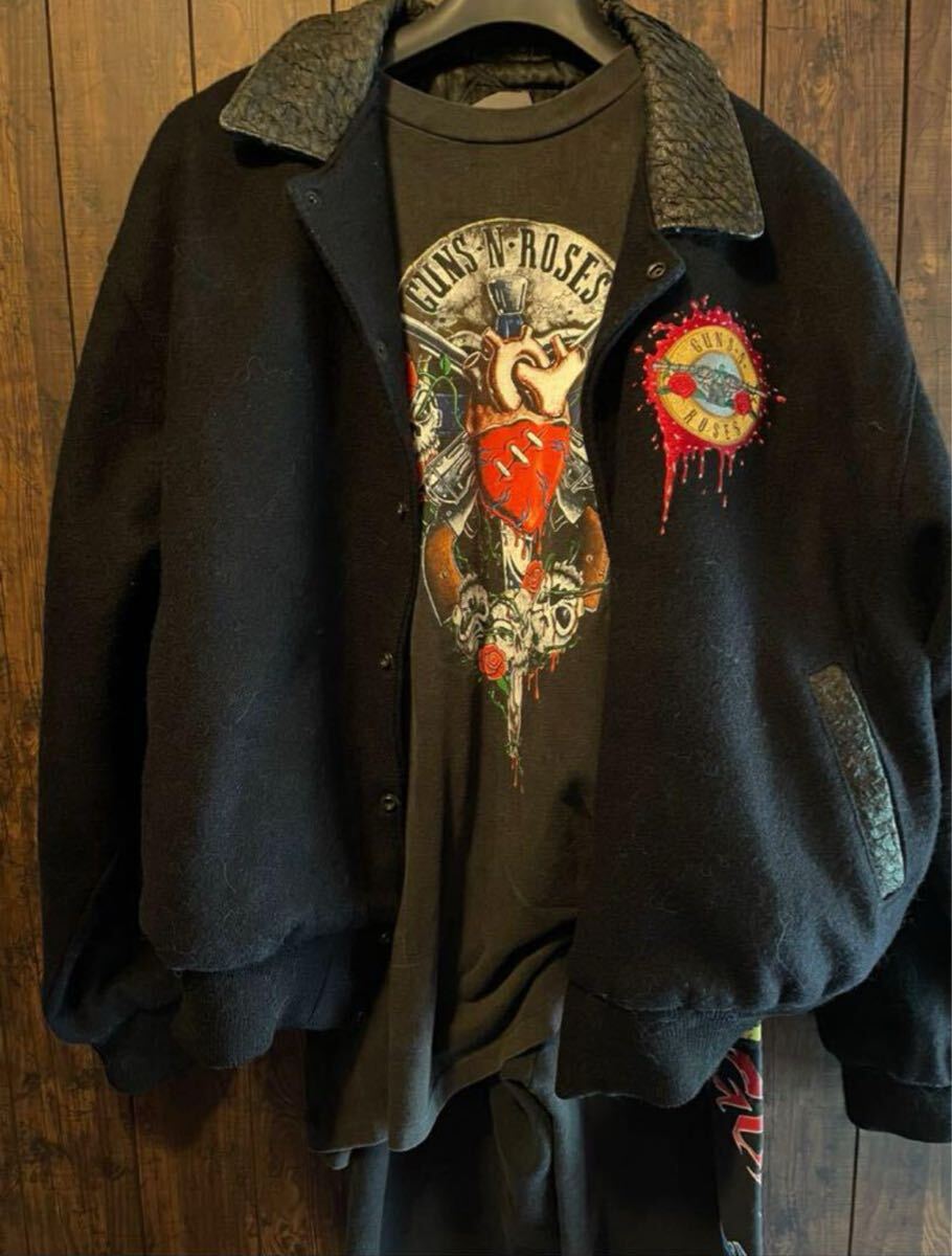 guns n roses が1993年3月17日にカナダのハミルトンコロシアムで行われたコンサートの際非常に限られたroad crewの為に作られたcrew限定のスタジャンになります 当時バンドの初期からセキュリティとして働いていた方から私自身が購入したものになります購入した際こちらのスタジャンがあまりにも市場に出てこないので当時どのくらいの数が配られたか尋ねたところ自分を含め数人しかもらえなかったと伺いました(画像4参照)過去にこれと同じジャケットがオークションに出品されたことがありますがその際も現存するのは12着未満と記載されており(画像5参照)恐らく関係者の分を含めても多くて30着ぐらいしか作成されなかったものだと思います 近年では数年前にguns n roses スラッシュの私物がオークションに出品され200万円を超える金額で落札されていました(画像3参照)その際の説明にもバンドメンバーに与えらたものとの説明がされていました