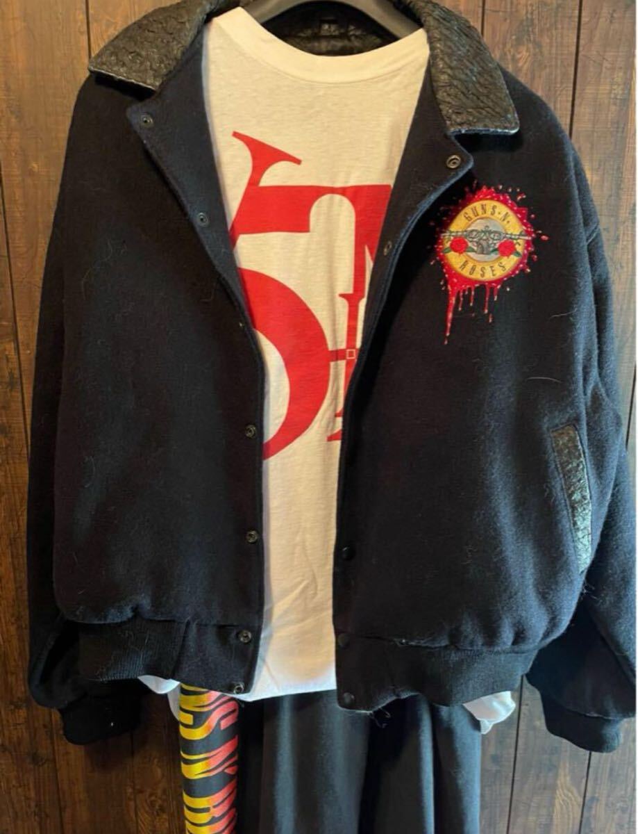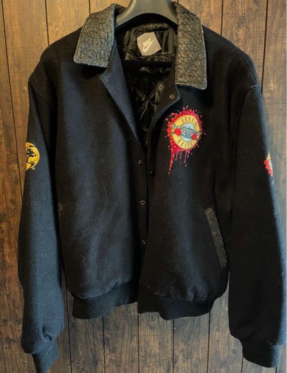 ちなみにバンドメンバーとcrewに与えられたものの違いはバンドメンバーに与えらたものが各メンバーの名前が刺繍されている点のみで他は全く同じ作りになりますバンドメンバーに与えらたものはもちろん希少ですがこちらの数人に与えらたスタジャンもかなり希少性が高く見つけることは非常に困難だと思います ガンズのスタジャンだけあってガンズのtシャツ等とも相性抜群です(画像6.7.8.9.10参考コーデ) ボディもnike製襟の部分とポケットの部分におそらくアリゲイターの素材が使われている非常に豪華な一品になりますサイズはL 肩幅60 身幅65 着丈69になります(素人採寸です多少の誤差はご了承下さい) プロフ必読よろしくお願い致します