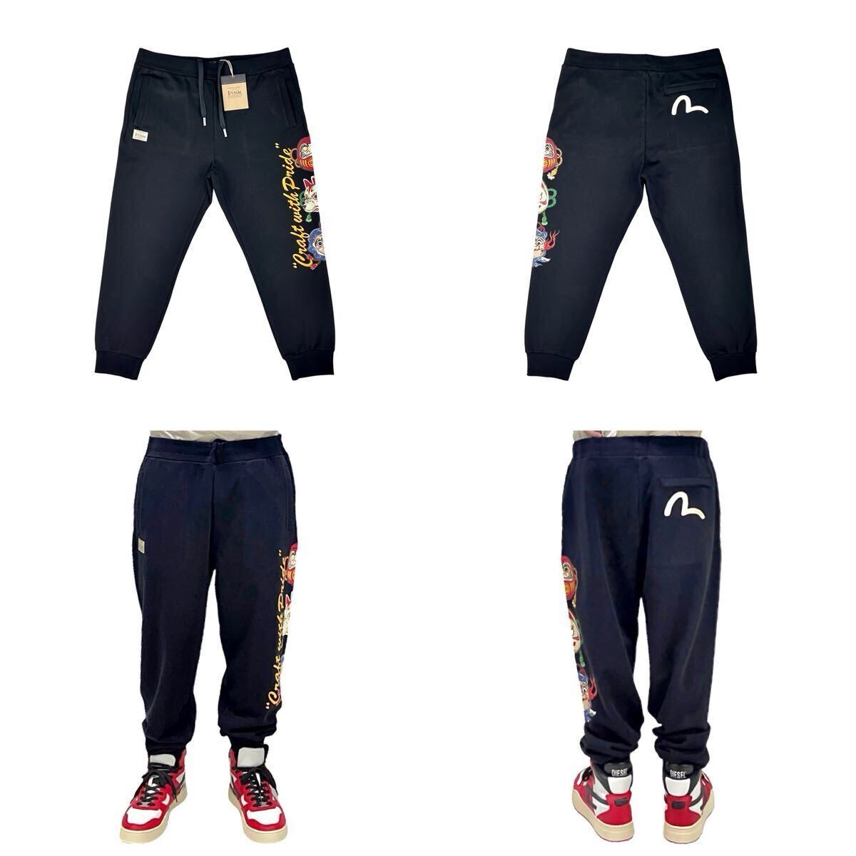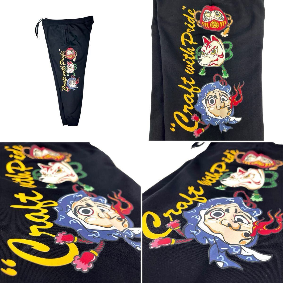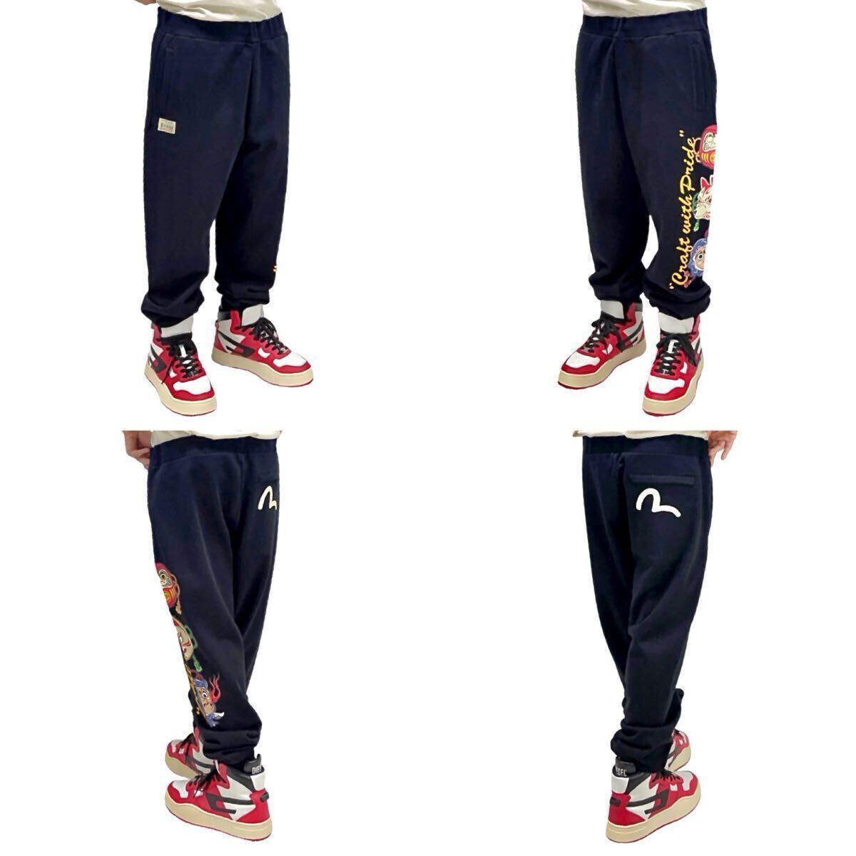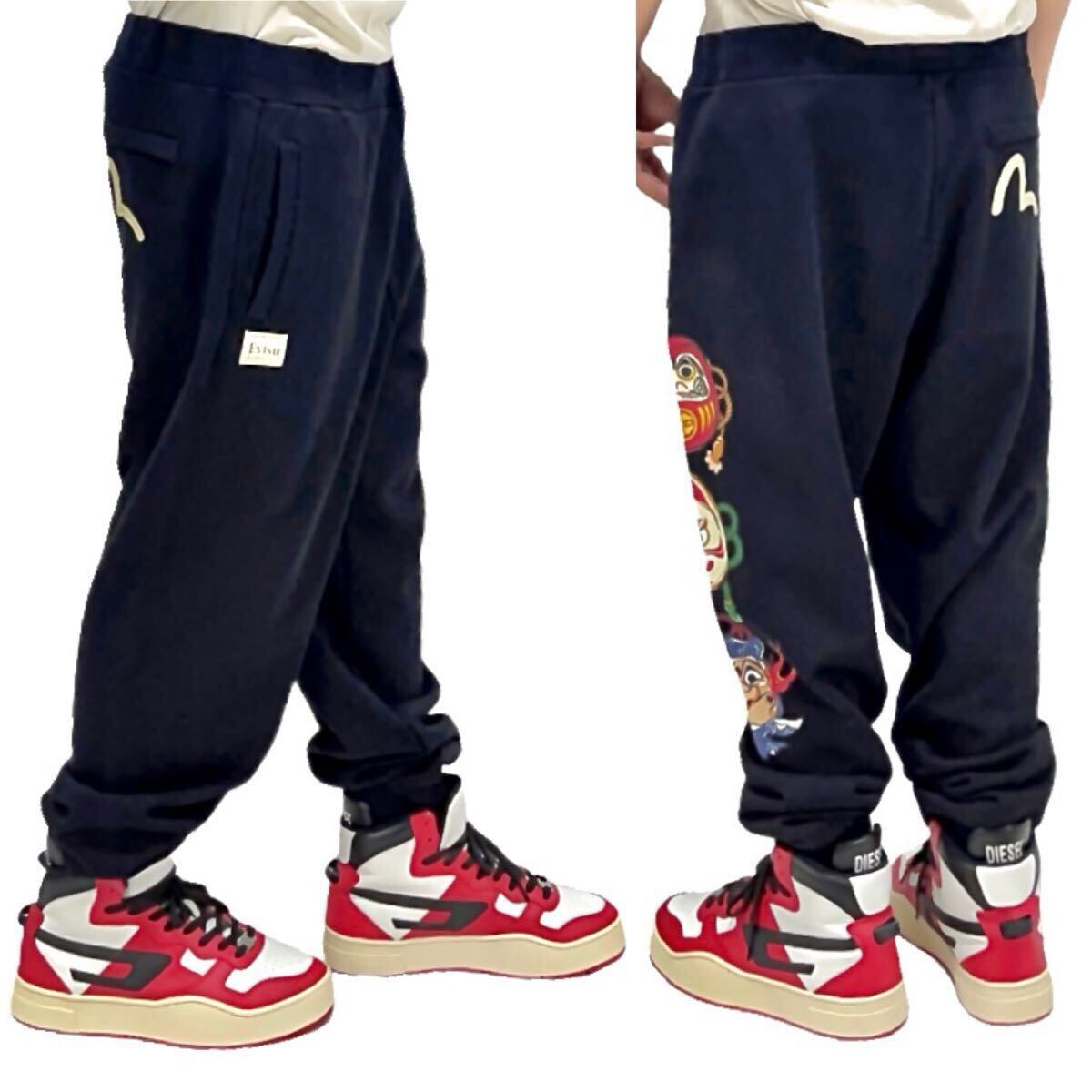 右足に達磨、狐、ひょっとこのお面のプリント、そして右バックポケットにはお馴染みのカモメステッチプリントがアシンメトリースウェットパンツ。