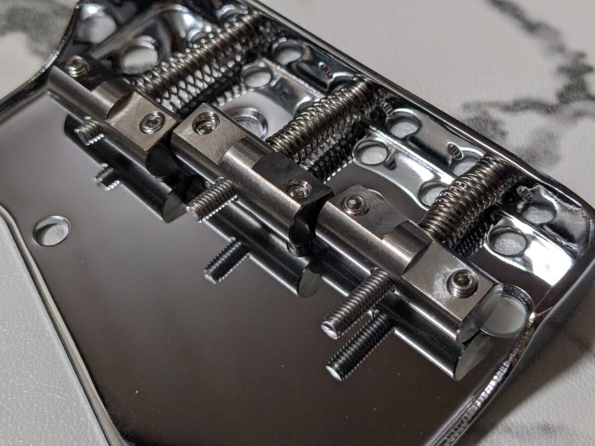 オクターブに配慮されたサドルには軽量ながら硬質なクリアさとサスティーンが人気のチタン製。