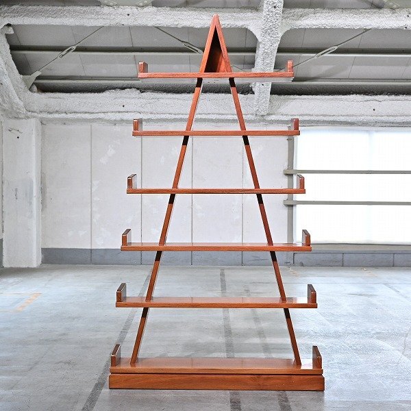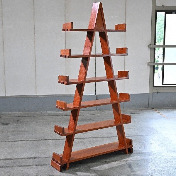 ユニークなA型構造がひときわ目を引く、存在感ある木製ディスプレイシェルフ。
