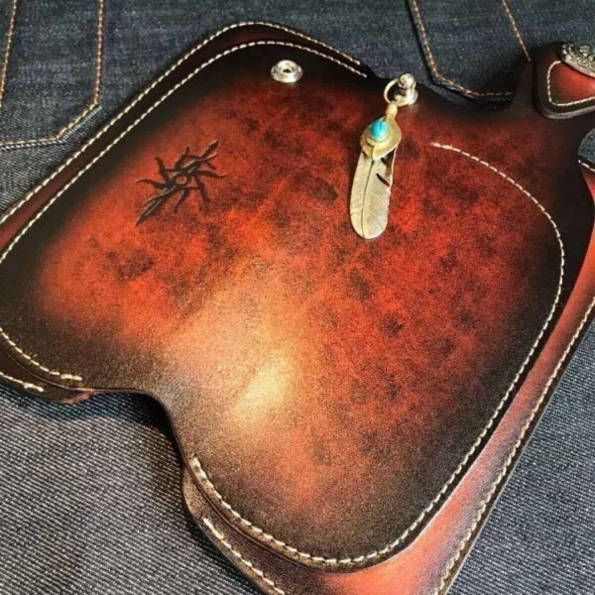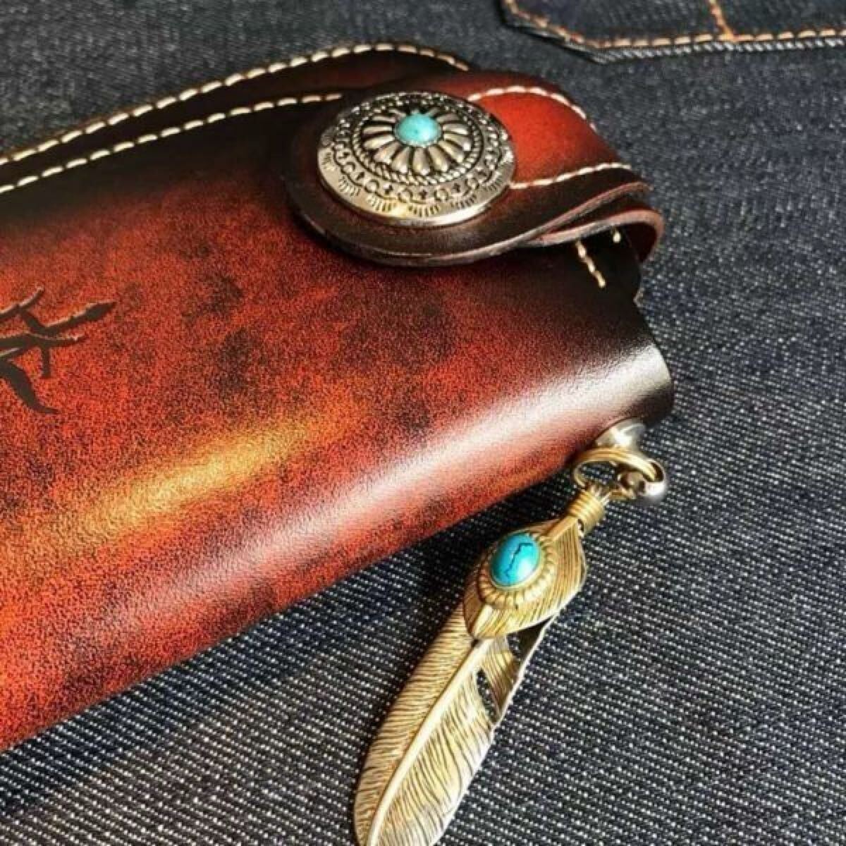 フロントには個性的な刻印とターコイズ調コンチョボタンを配置、さらに羽根チャーム付きで存在感抜群。
