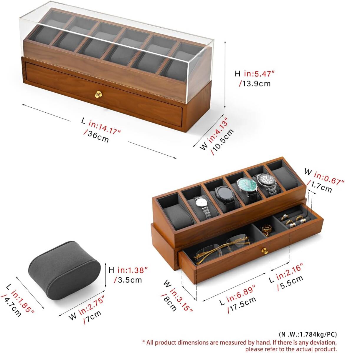 ・収納本数:腕時計6本(上段)、アクセサリー3エリア(引き出し部分)