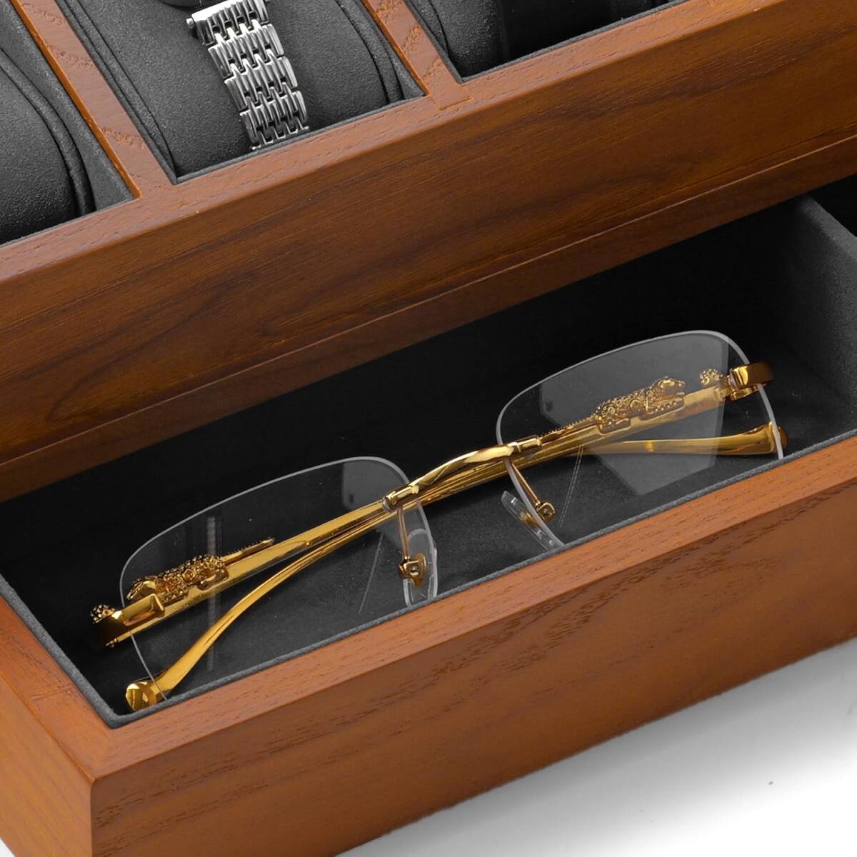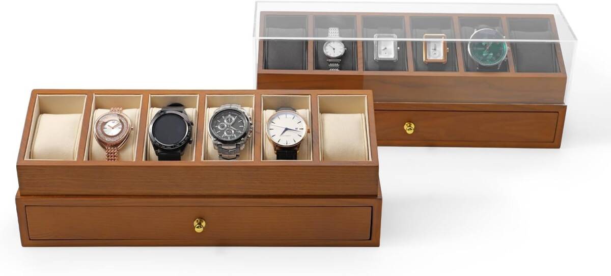 上段には6本の腕時計を立てて収納でき、下段には引き出しが付いていてアクセサリーやメガネなどが整理しやすいです。透明なアクリル蓋がついているので、大切な時計をほこりから守りながら中身を見渡せます。