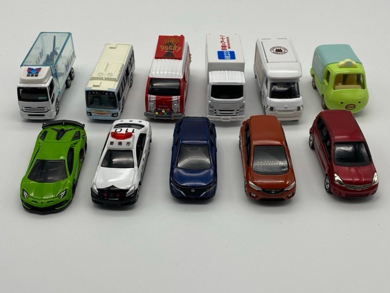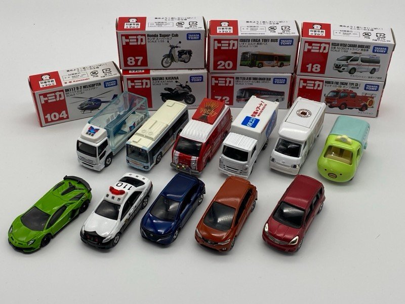 ・いすゞ エルガ 都営バス (シール付き) ・いすゞ エルフ アート引越センター ・すみっコぐらし ぺんぺん アイスクリーム ・すみっコぐらし ぺんぺん アイスクリーム 臨港バス ・トヨタ クラウン パトロールカー ・トヨタ タウンエース カロ・ビー ・トヨタ ハイエース グリコワゴン ・日産 NV350 キャラバン 救急車 ・日産 ディーゼル クオン 水族館トラック ・日産 ノート 赤 (キズ・汚れあり) ・日産 ノート 青 ・日産セレガ ジェイアールバス東北 こまちカラー ・ホンダ FIT ・モリタ CD-Ⅰ型 ポンプ車 ・ランボルギーニ アヴェンタドール SVJ ・スズキ KATANA ・ホンダ スーパーカブ (左ハンドル欠損) ・BK117 D-2 ヘリコプター |