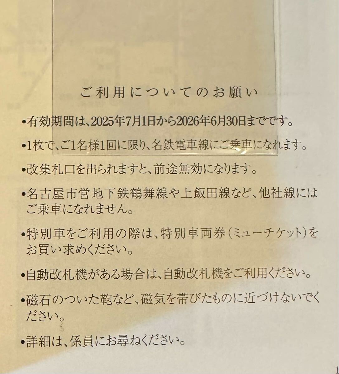 名古屋鉄道(名鉄)の株主優待乗車券です。