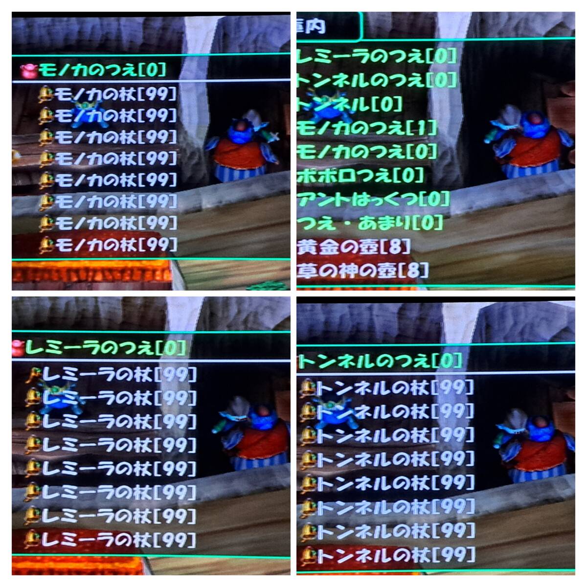 ・ドーピング用に草うけの杖99と草投げの杖99、ちからのたね、しあわせのたね等もあります。
