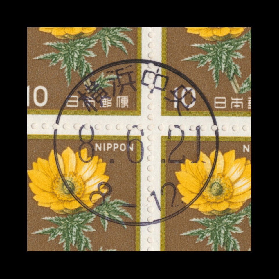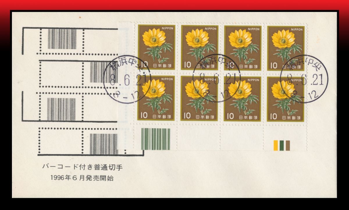 H86 バーコード付発売開始月カバー|福寿草10円第3コーナー8枚ブロック/CM下付 丸型印:横浜中央/8.6.21/8-12 記念押印