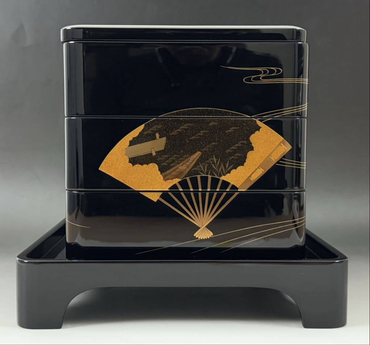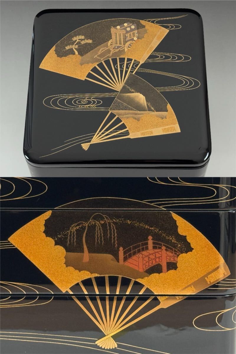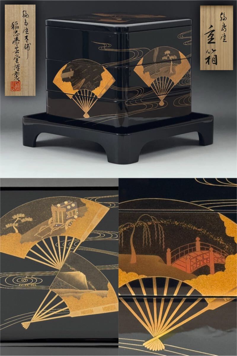 極上 輪島塗 扇面 蒔絵 重箱 三段重 重台 付 胴張 共箱 稲忠漆芸堂 謹製 | |||