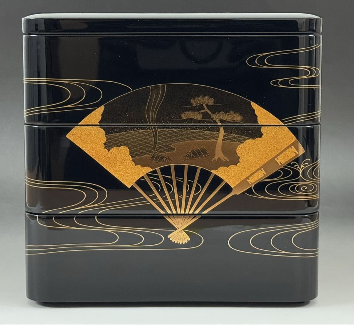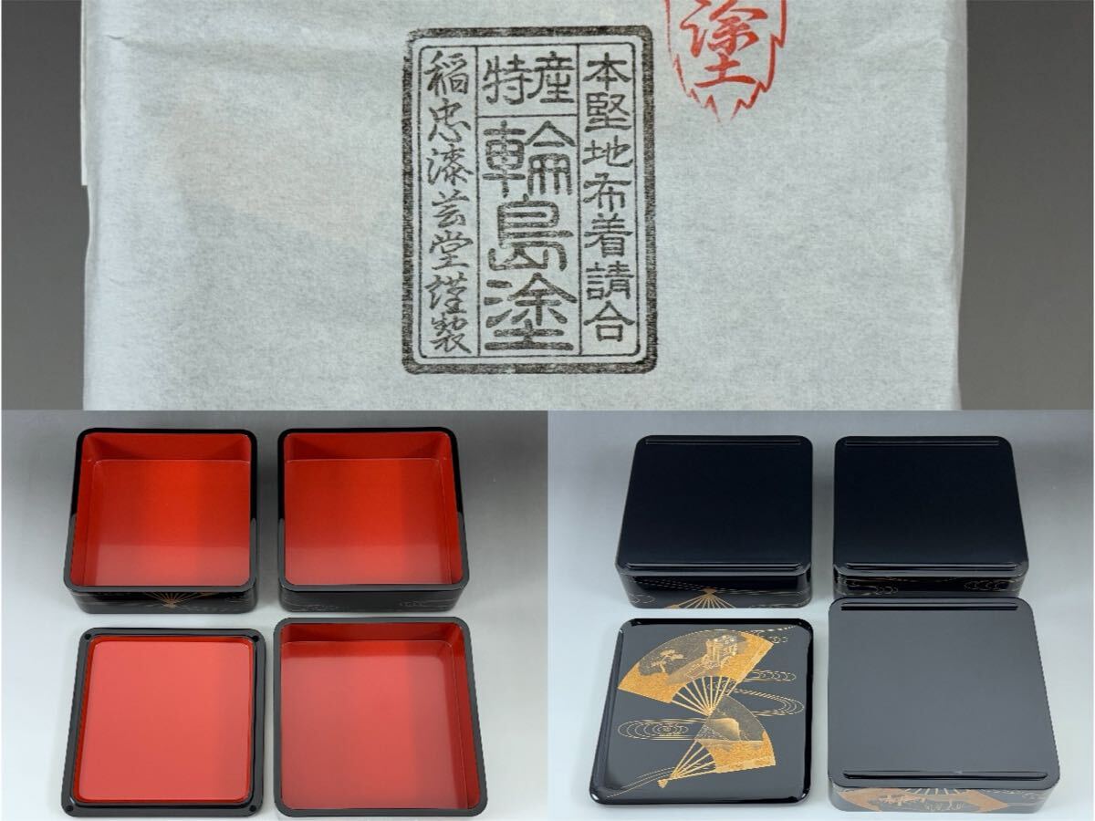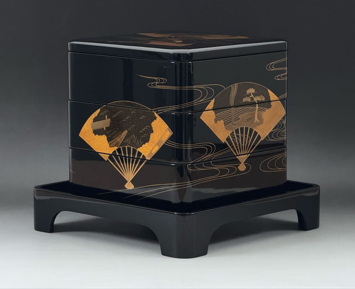 極上 輪島塗 扇面 蒔絵 重箱 三段重 重台 付 胴張 共箱 稲忠漆芸堂 謹製 | |||