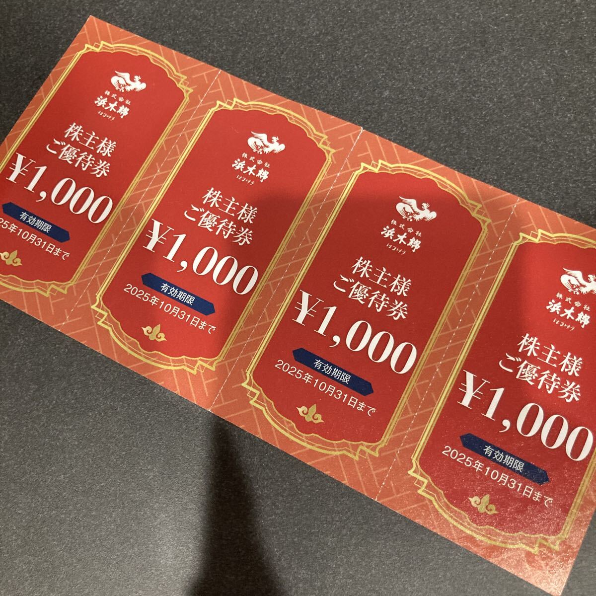 浜木綿の株主優待4000円分のお食事券です。有効期限は画像よりご確認ください。入金確認後翌日迄に発送致します。