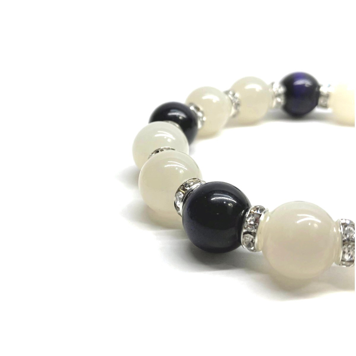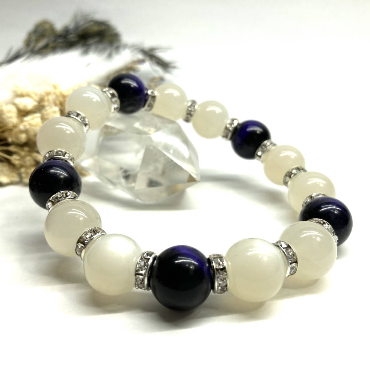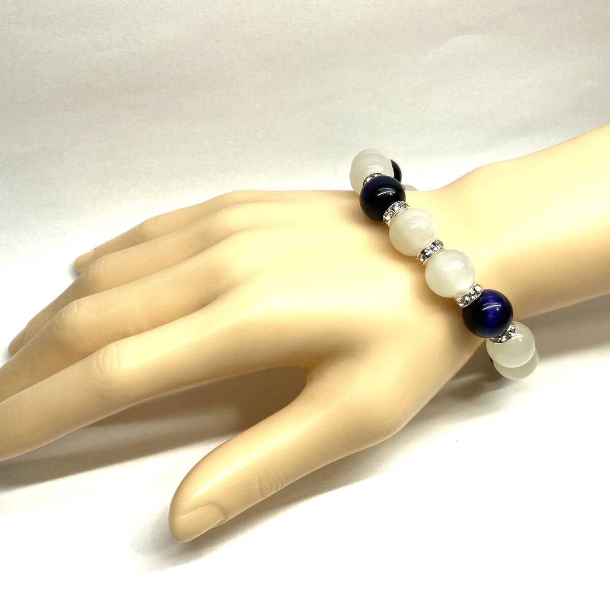 こちらは、ムーンストーンとパープルタイガーアイを組み合わせたパワーストーンブレスレットです。間にはロンデルを挟み高級感あるデザインに仕上げております。程よくインパクトがある12mm玉を使用して内周約18cmです。(サイズ変更の場合は取引ナビにてご連絡をお願いします。) 数に限りがございますので気になる方はお早めにどうぞ。