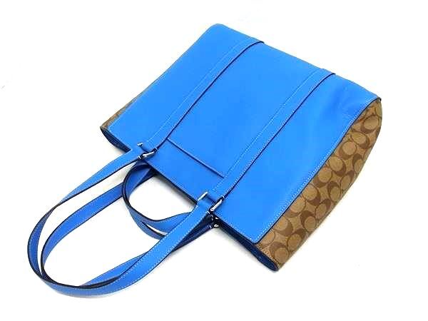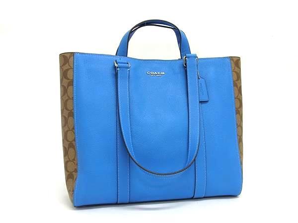 1円 ■美品■ COACH コーチ CJ495 シグネチャー レザー ハンドバッグ トートバッグ レディース メンズ ブルー系×ブラウン系 FU2461