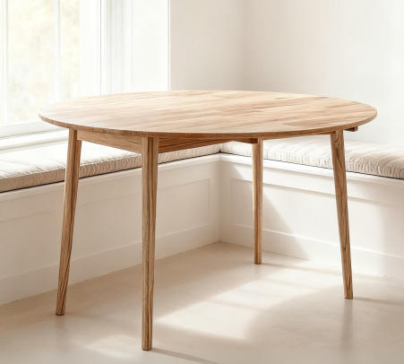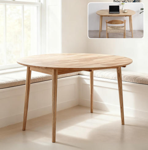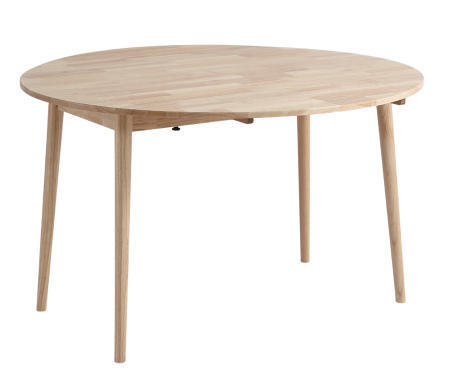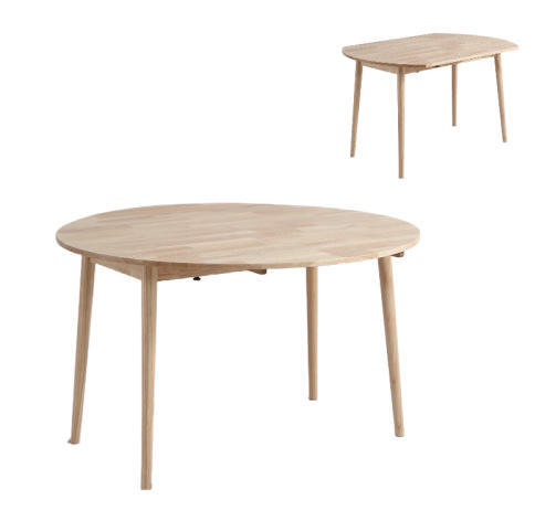 • 【90-120㎝に伸長する円形ダイニングテーブル】 最大4人での使用が可能。 天板の両側がたためる仕様。 片方を折り畳み半円での普段使い、円形に広げて使用来客や作業に対応。 収納時の折り畳みサイズは幅84*120cmになり、コンパクト収納となる。 天然木を使用し、天板はしっかり面取り加工をしているため、小さなお子様でも安心。