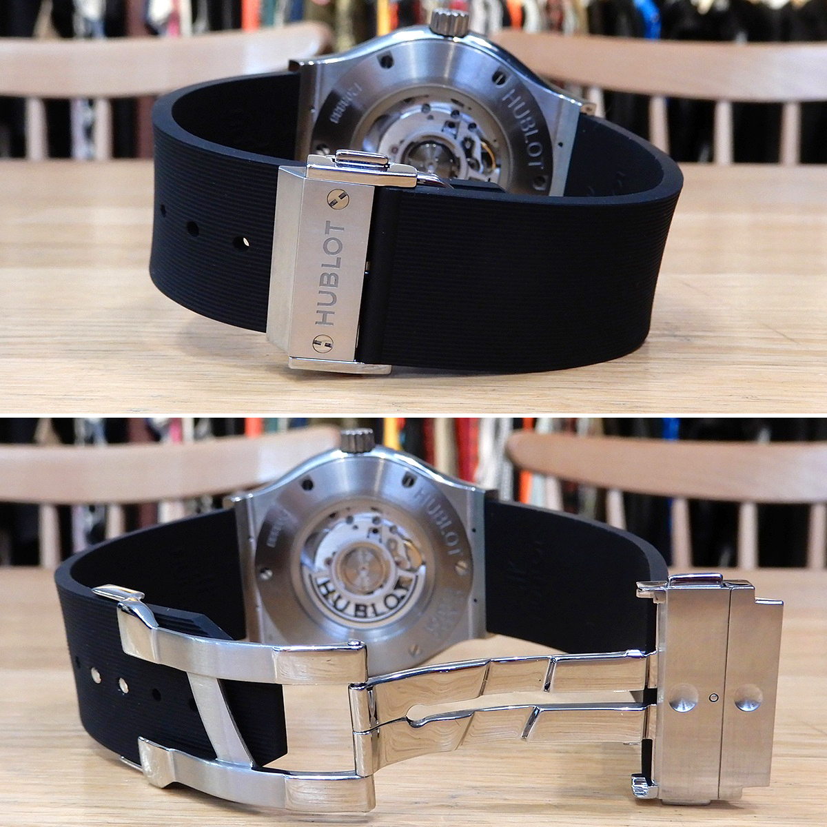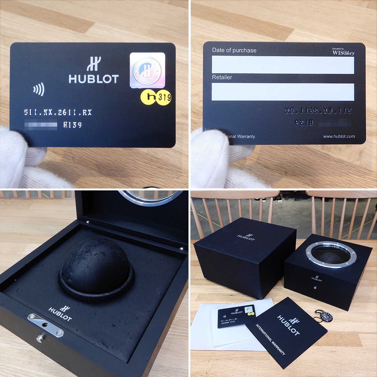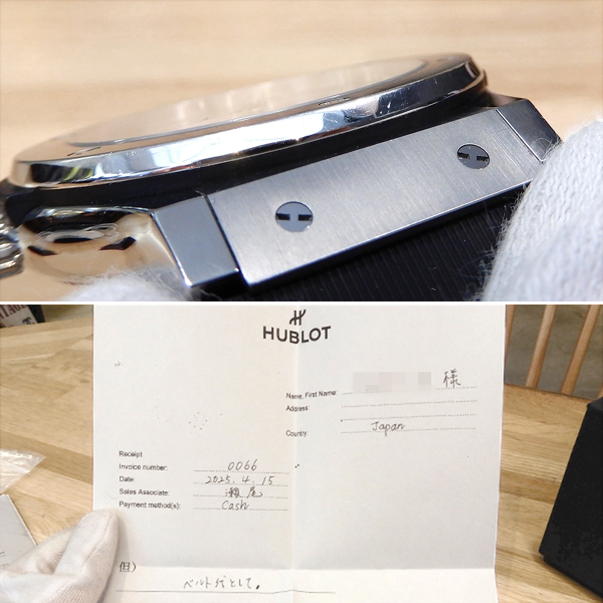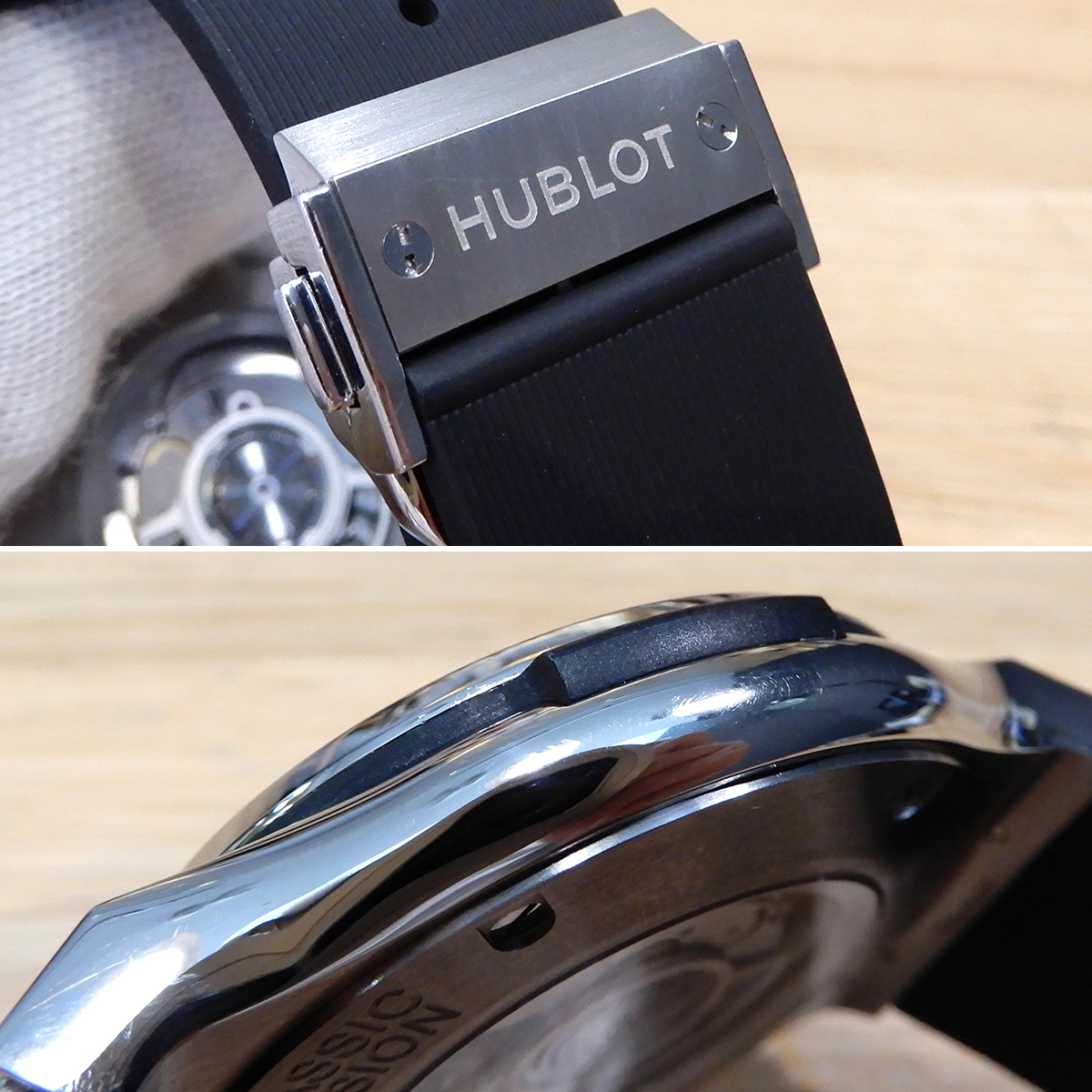 清掃・簡易研磨・動作確認済み。簡易研磨で取り切れなかったわずかな小キズが見受けられます。2025.04.15.ウブロ大阪心斎橋ブティックにてラバーベルトを新品に交換しております。内箱は経年によるベタツキがでておりますので、社外箱に入れて発送させていただきます。