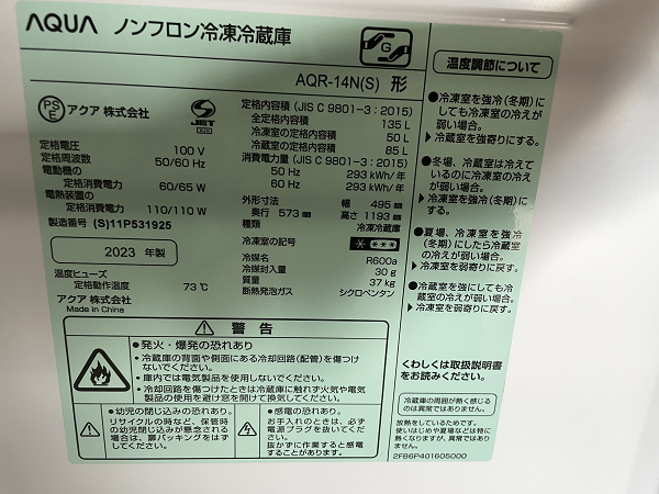 【美品】AQUA 2ドア冷蔵庫 AQR-14N 2023年製 通電確認済み 低温フリーケース フラットデザイン&壁ピタ設置 ガンメタ