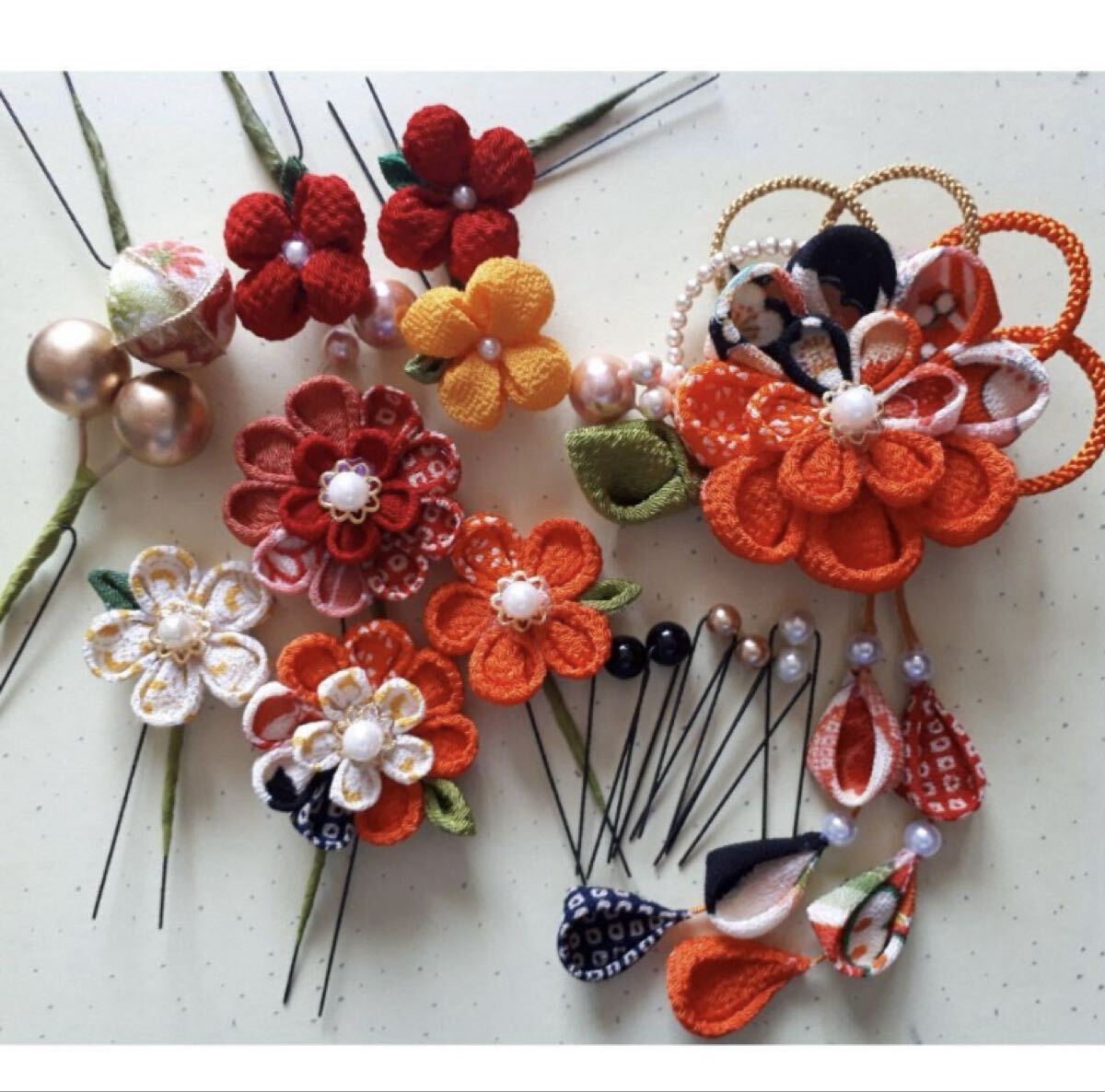 髪飾りにある赤、白、黒、黄等の着物にも合うと思います。