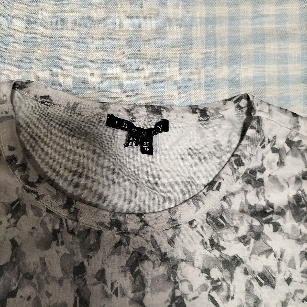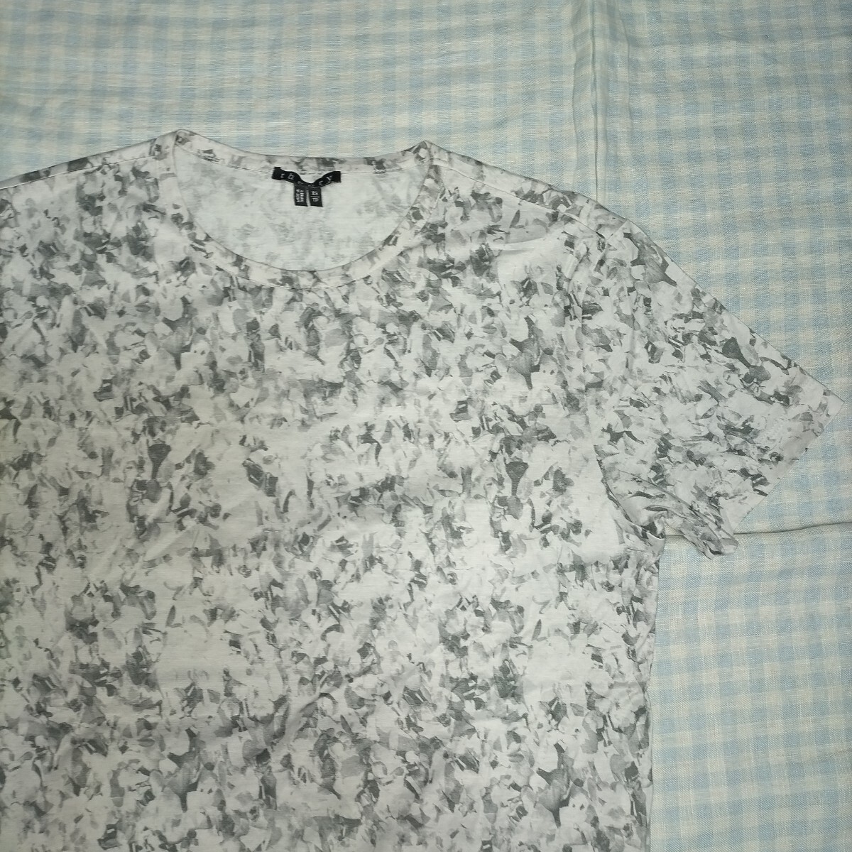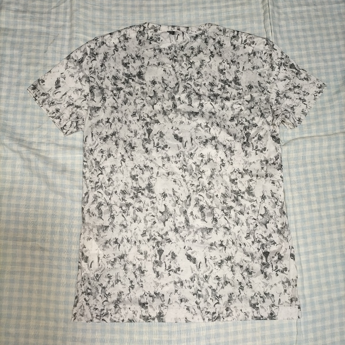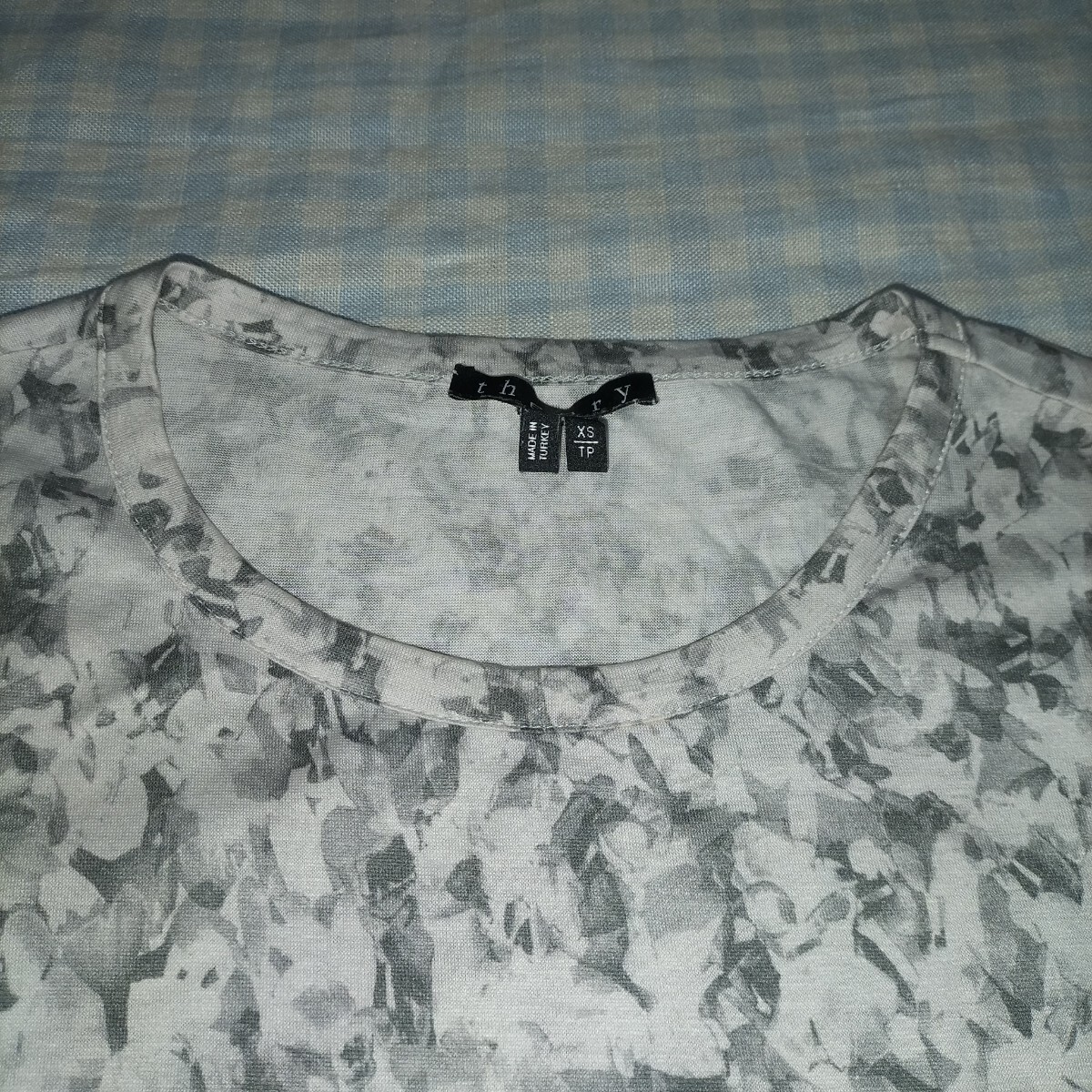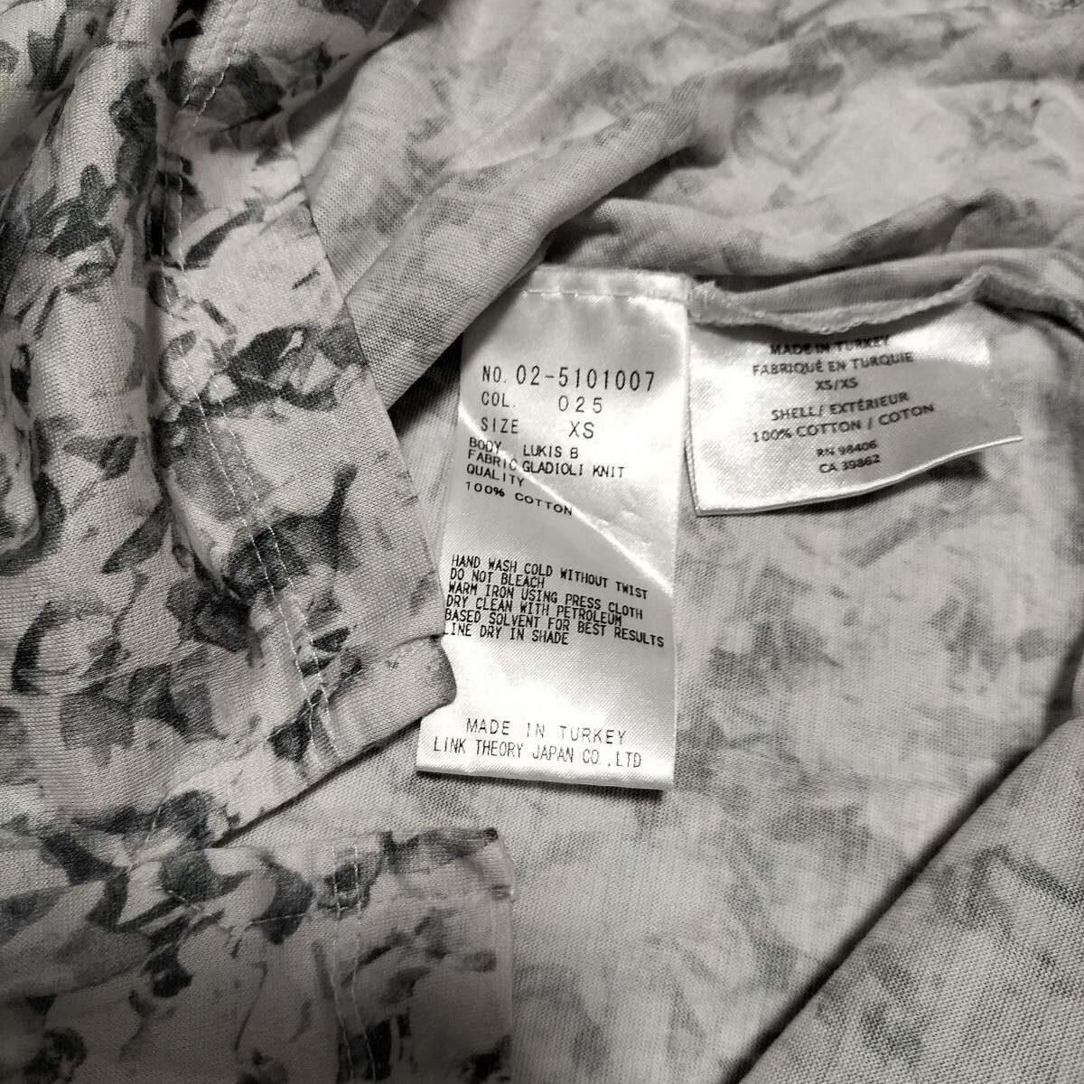 色はグレーの濃淡模様のプリント 素材は綿100% トルコ製 サイズXS ですが、日本のレディースM〜L 程度です。 平置き実寸:肩幅40cm胸幅45cm袖丈17cm着丈64cm
