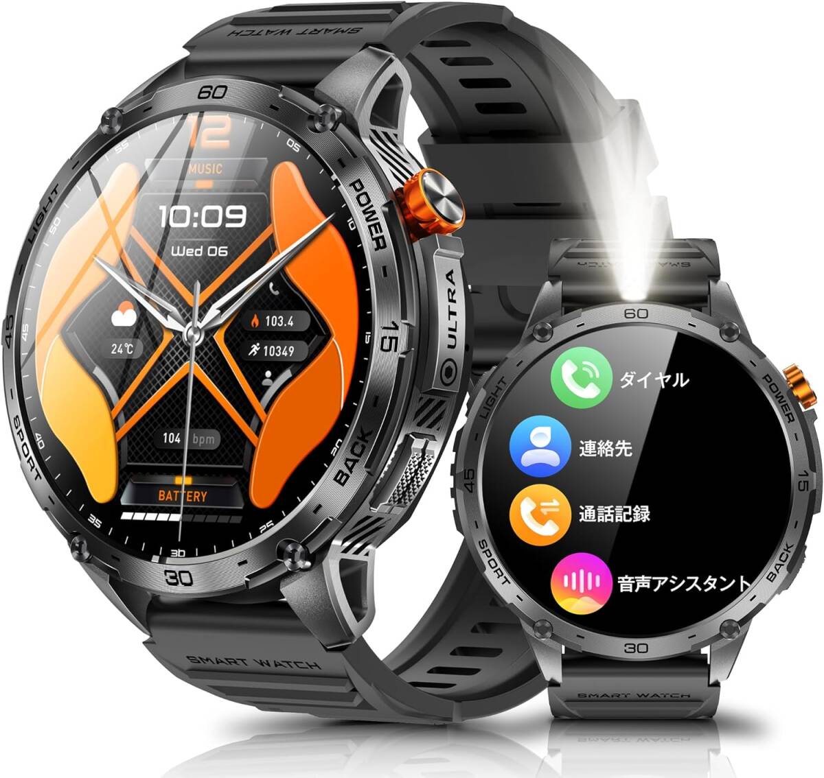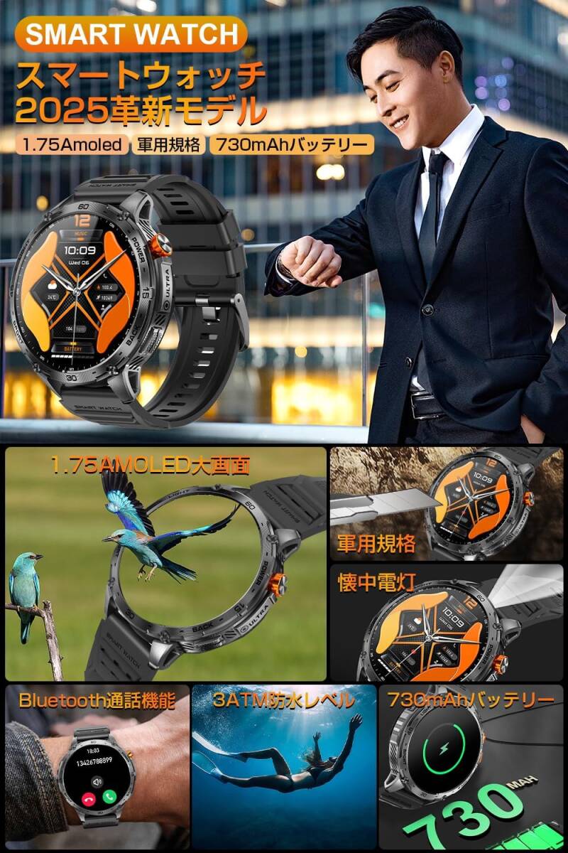 スマートウォッチ 【2025革新モデル 軍用規格&730mAh大容量バッテリー】懐中電灯付き1.75AMOLED高精度画面