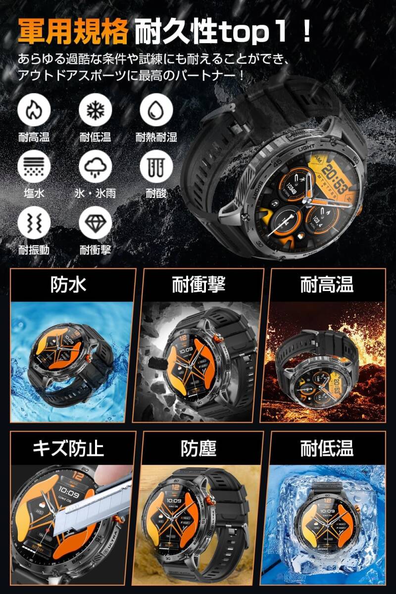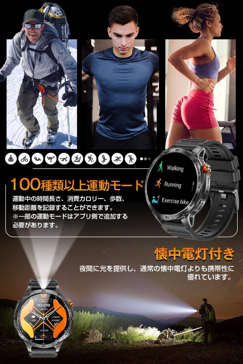 • 【1.75インチAMOLED高精度画面&軍用規格】本スマートウォッチは高精度1.75インチAMOLEDタッチスクリーンを搭載され、より美しく、豊かになった画面内容を表現できます。466*466の高解像度で、画質がより鮮明になり、よりクリアして、直射日光下でも画面もはっきり見えます。スマートウォッチ 軍用規格の金属フレームは、高い強度と硬度が特徴で、長時間使用しても剥がれたり変色したりすることがありません。スクリーン自体に使われている素材はとても頑丈で、熱帯雨林でも、極地の氷河でも、あらゆる過酷な条件や試練にも耐えることができ、簡単に壊れにくく、アウトドアスポーツの最高のパートナーです!