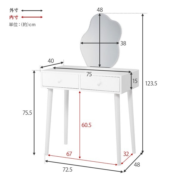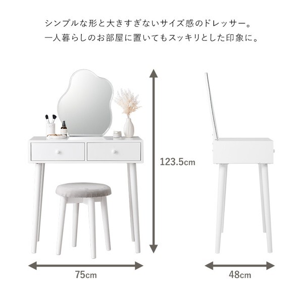 ※現在ご覧の商品ページはホワイト/スツール付のご購入ページとなります。 ホワイトのシンプルな本体に特徴的なウェーブミラーを合わせた大人可愛いデザインのドレッサーセット。 たっぷり収納ができて、一緒に使えるスツール付と使い勝手も優れています。 配達業者を指定いただくことはできません。 北海道/沖縄/離島のお届けに別途中継料金が発生します。 ※別途送料が発生する場合は後ほどご連絡させていただきます。 当店は正規店です。 タイミングによっては在庫切れの場合があります。