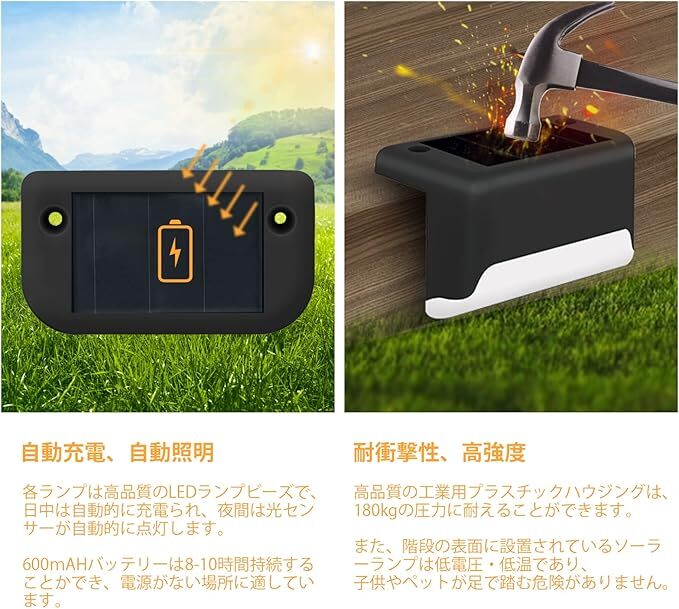 【優れた素材、IP65防水】当社の階段ソーラーライトは、業界で優れた放熱性能を備えた高品質のLED光源チップ、最大93%の太陽光変換率を備えた高品質のポリシリコンソーラーパネルと耐久性のあるABSハウジング、プラスチックプラグスイッチ、ライトセンサー装置で作られます。強風、大雪、砂利、自然災害に耐えることができます。 IPX65の防水性能を備えたソーラーライトは悪天候でも対応可能です。安心して利用いただけるソーラーライトです。
