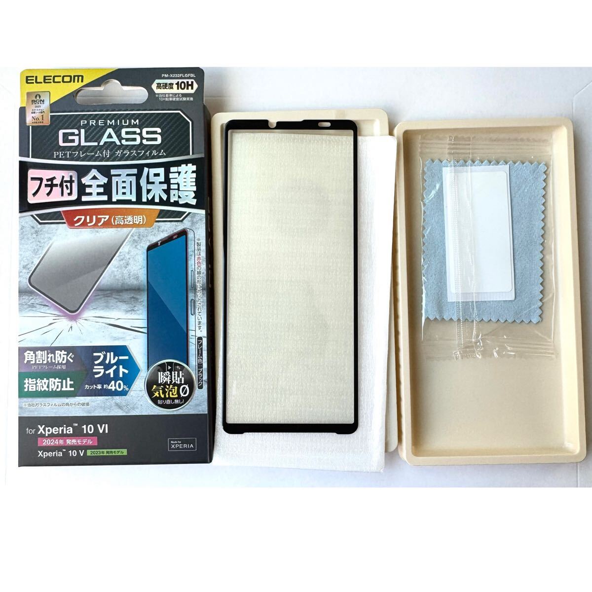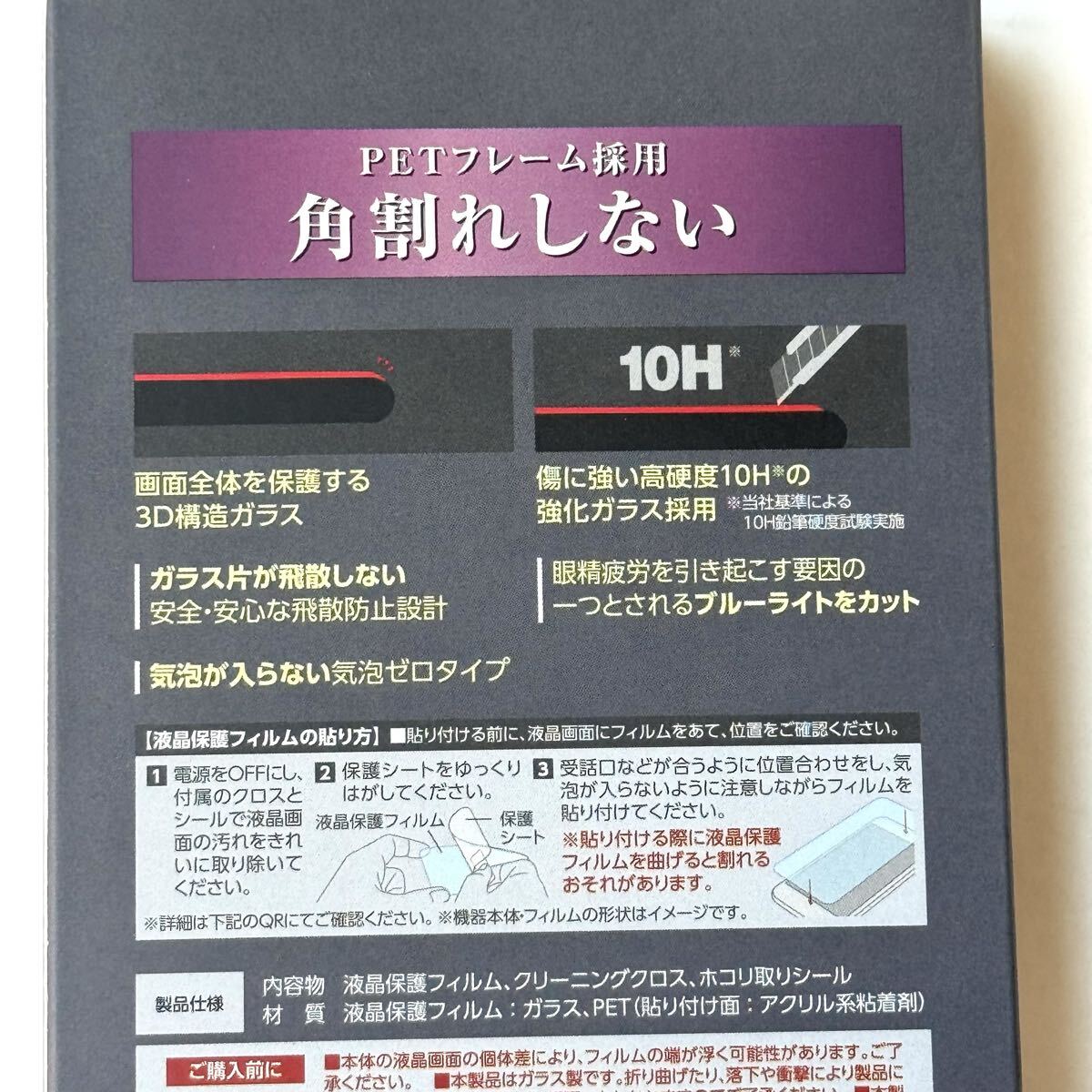 セット内容:画面保護ガラス(フレーム付き、ブルーライトカット仕様)×1、クリーニングクロス×1、ホコリ取りシール×1