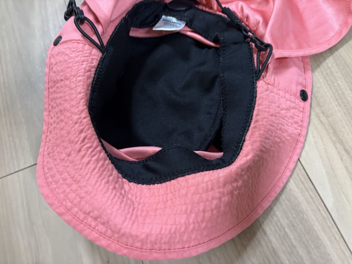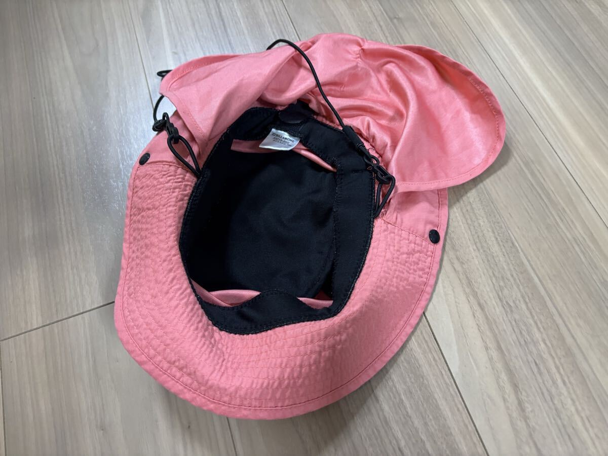 後頭部を守る日除けガードや取り外し可能なループストラップ、サイドをロールアップできるボタン付。