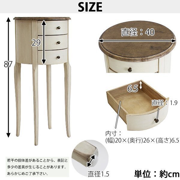商品名 | アンティーク調 ラウンドチェスト W約40×D約40×H約87cm ホワイト 花台 ラウンド 3段 三段 引出し 引き出し アンティーク家具 木製 チェスト アンティーク風 アンティーク インテリア 家具 リビング収納 シャビーシック シャビー 白 antiqueh37wh |