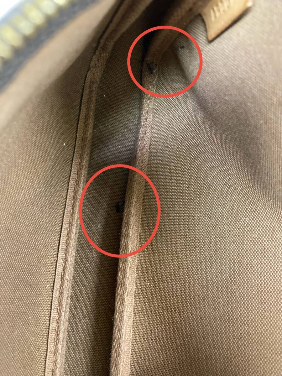 状態:内部にシミ汚れあり、チャック部分のロゴ剥がれあり、ストラップ無し