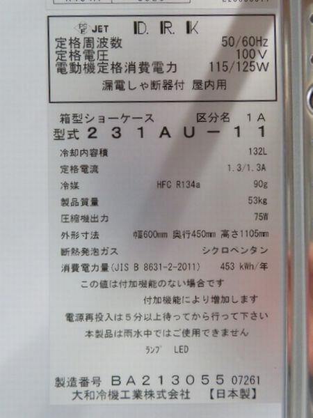 ◆ダイワ 2021年◆冷蔵ショーケース 231AU-11 100V 600×450×1105 サイズ:W600×D450×H1105mm 電 源:100V 有効内容積:132L 収納能力:ビール中ビン 61本・ビール大ビン 51本・350ml缶 74本 製品質量:53kg 定 価:248,600円 出品にあたり動作確認・クリーニング済みです。 多少の傷・使用感等がありますので、予めご了承ください。 中古品ですので、画像をよくご確認の上、ご理解頂ける方のご入札をお願いいたします。 神経質な方はご入札をご遠慮ください。 気持ちの良いお取り引きにしたいと思いますので、ご不明な点等ございましたらお気軽にご質問ください。 | |