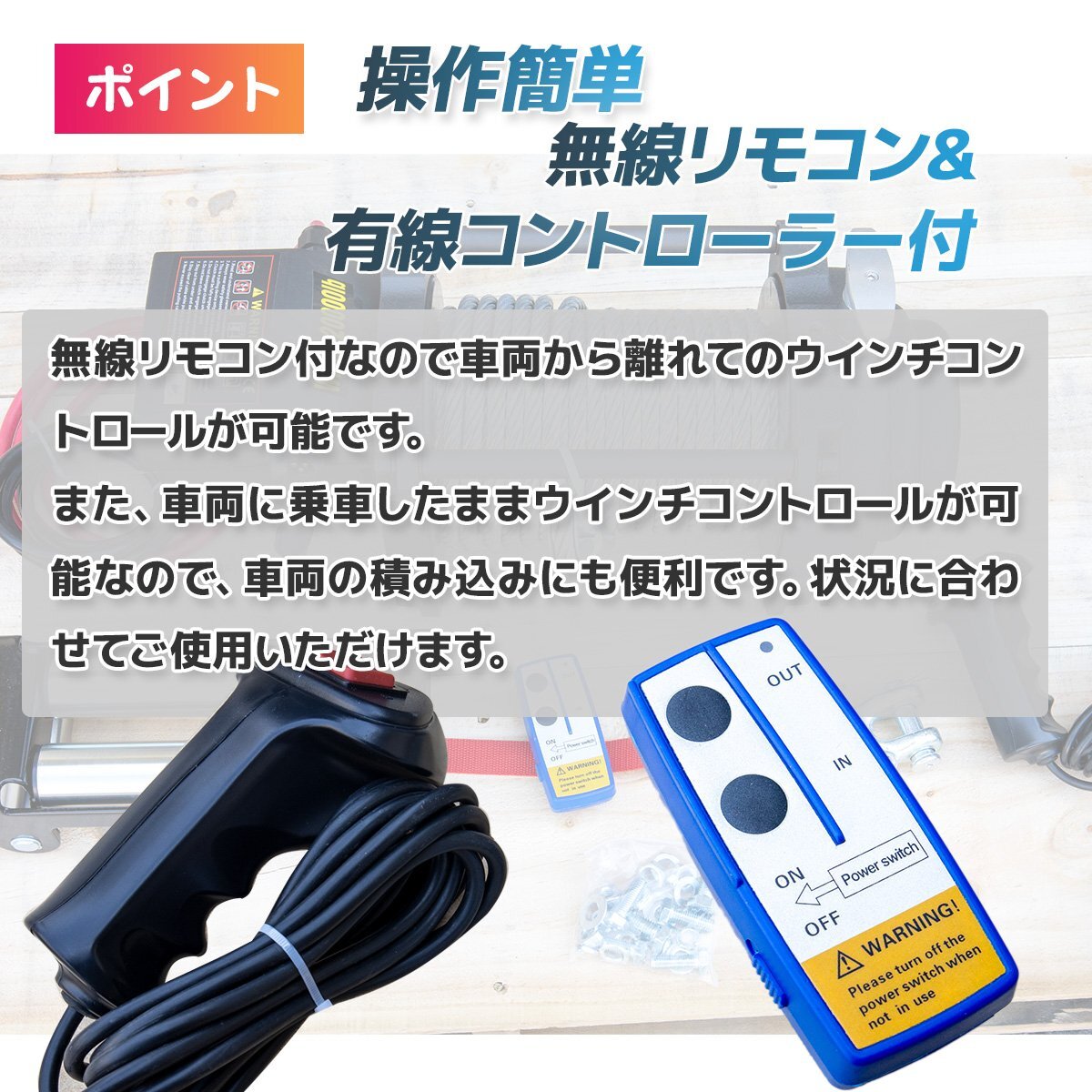 無線リモコン付きなので車両から離れてのウインチコントロール、牽引対象物側でのウインチコントロールが出来ます。