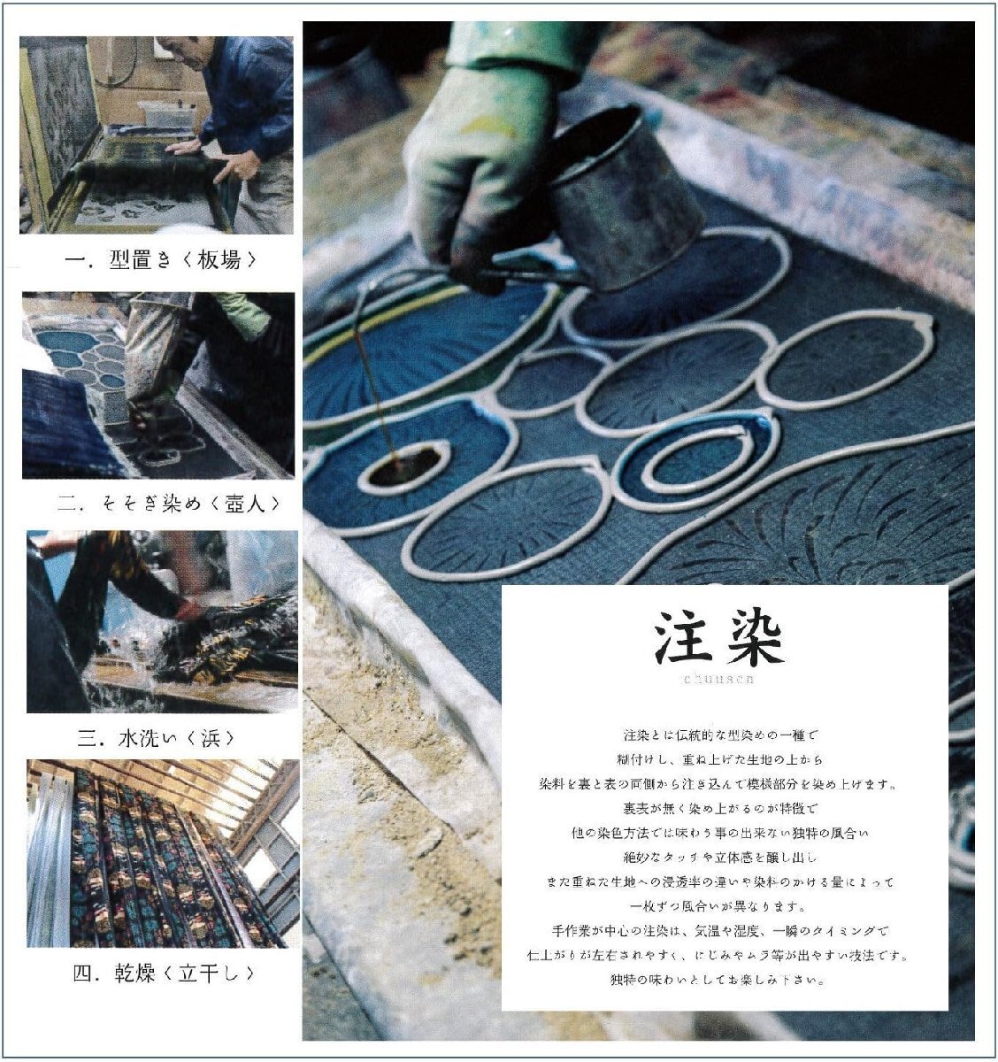 染料を注ぎ、模様部分を染め上げる伝統的な型染めの一種です。