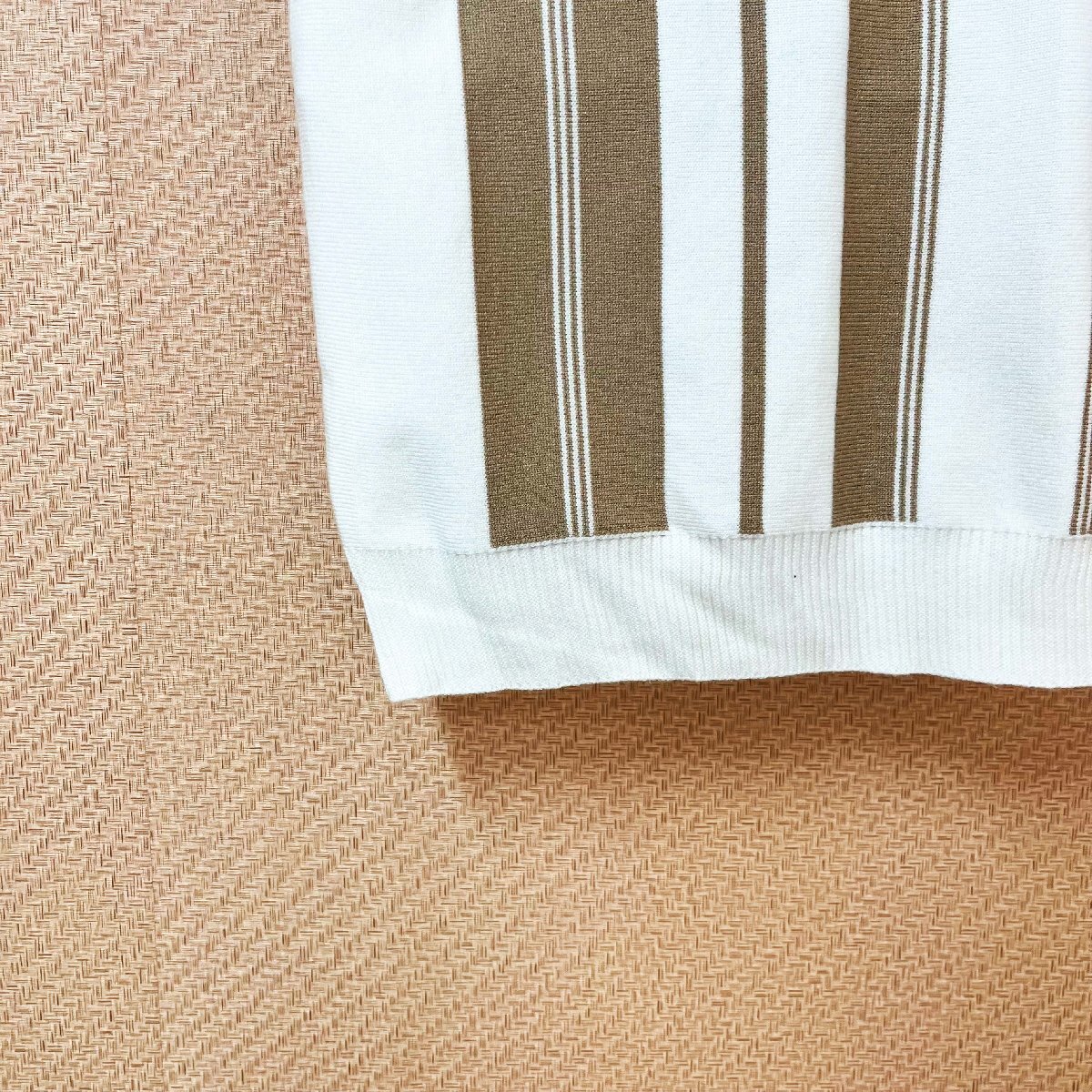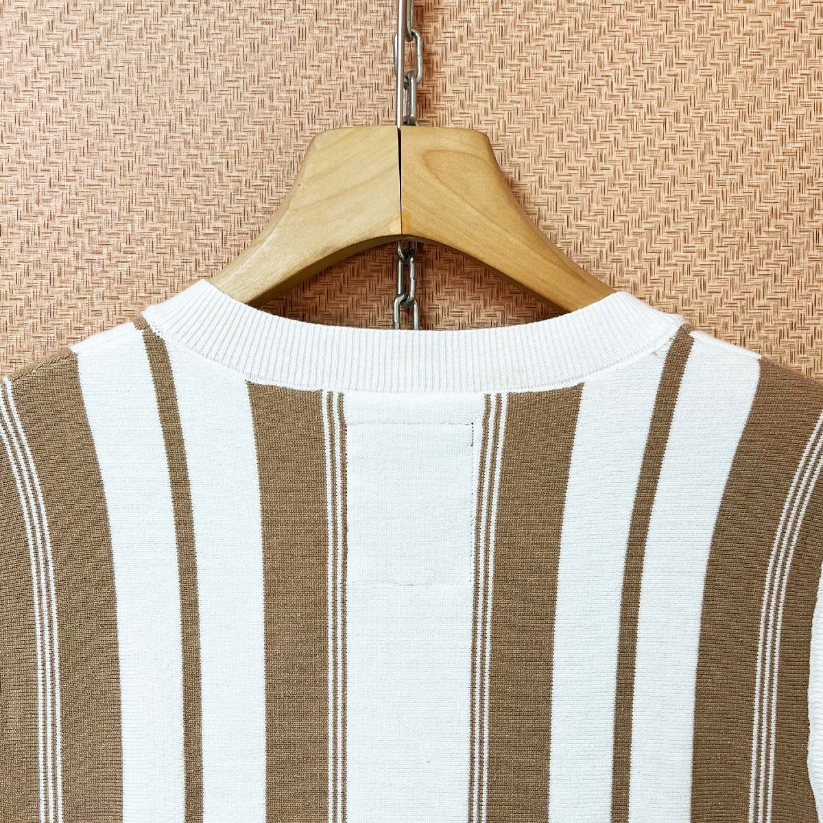 ベーシックで着回しやすい無地ベースに、立体感のあるストライプ柄をデザインが、さりげないアクセントに。首元はすっきりとしたVネック仕様で、シャツやカットソーとのレイヤードに最適です。ゆったりとしたリラックスシルエットで、抜け感のある着こなしが楽しめ、体型カバーにも効果的。