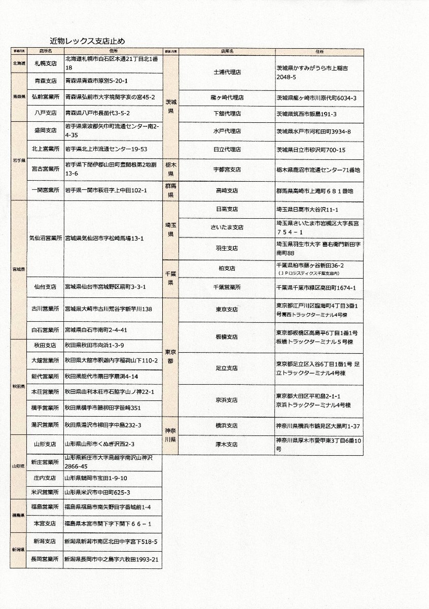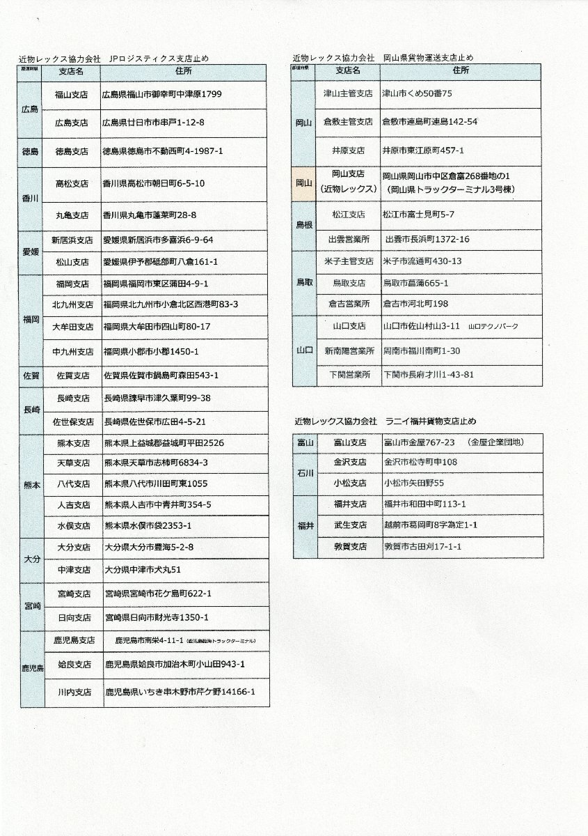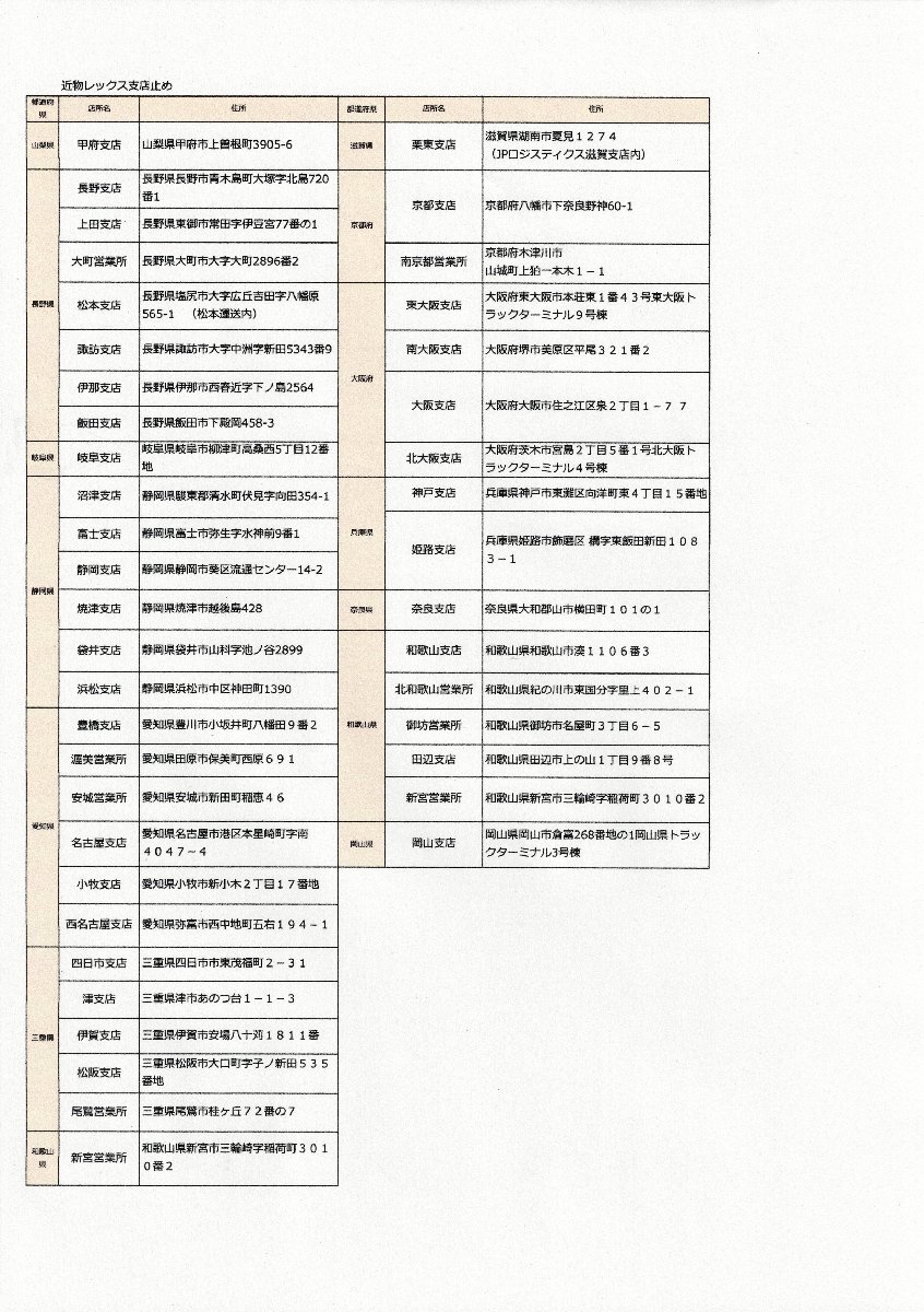 支店止め先  リストにある近物レックスの支店または近物レックス協力運送会社支店止めのみ