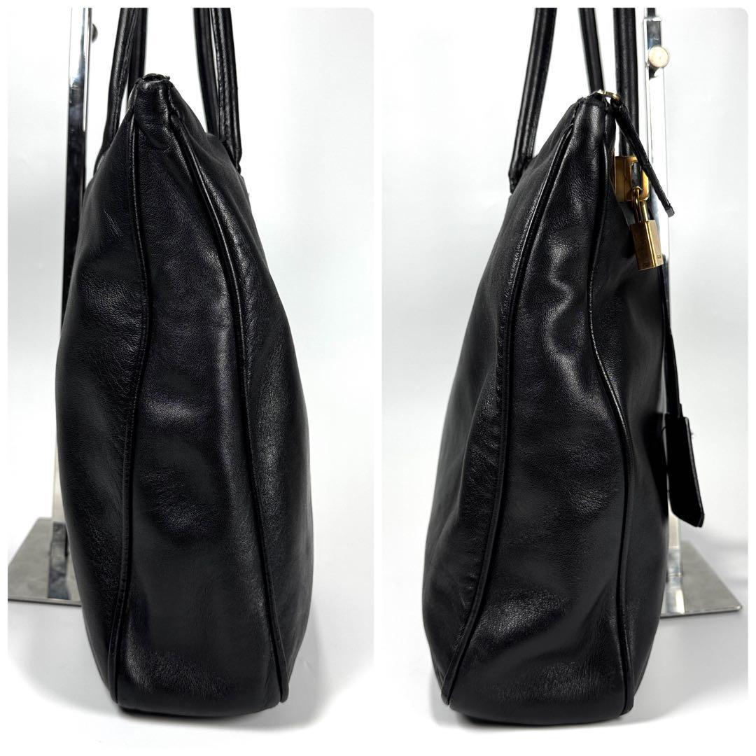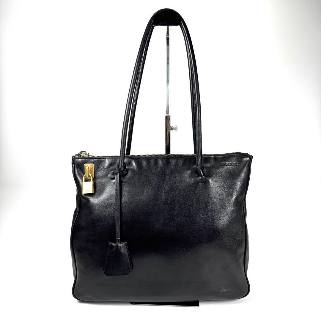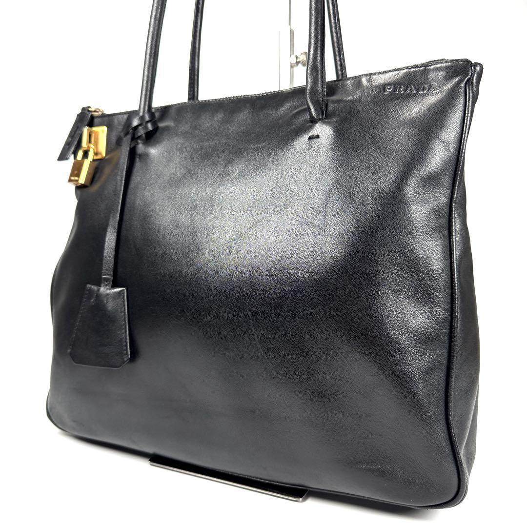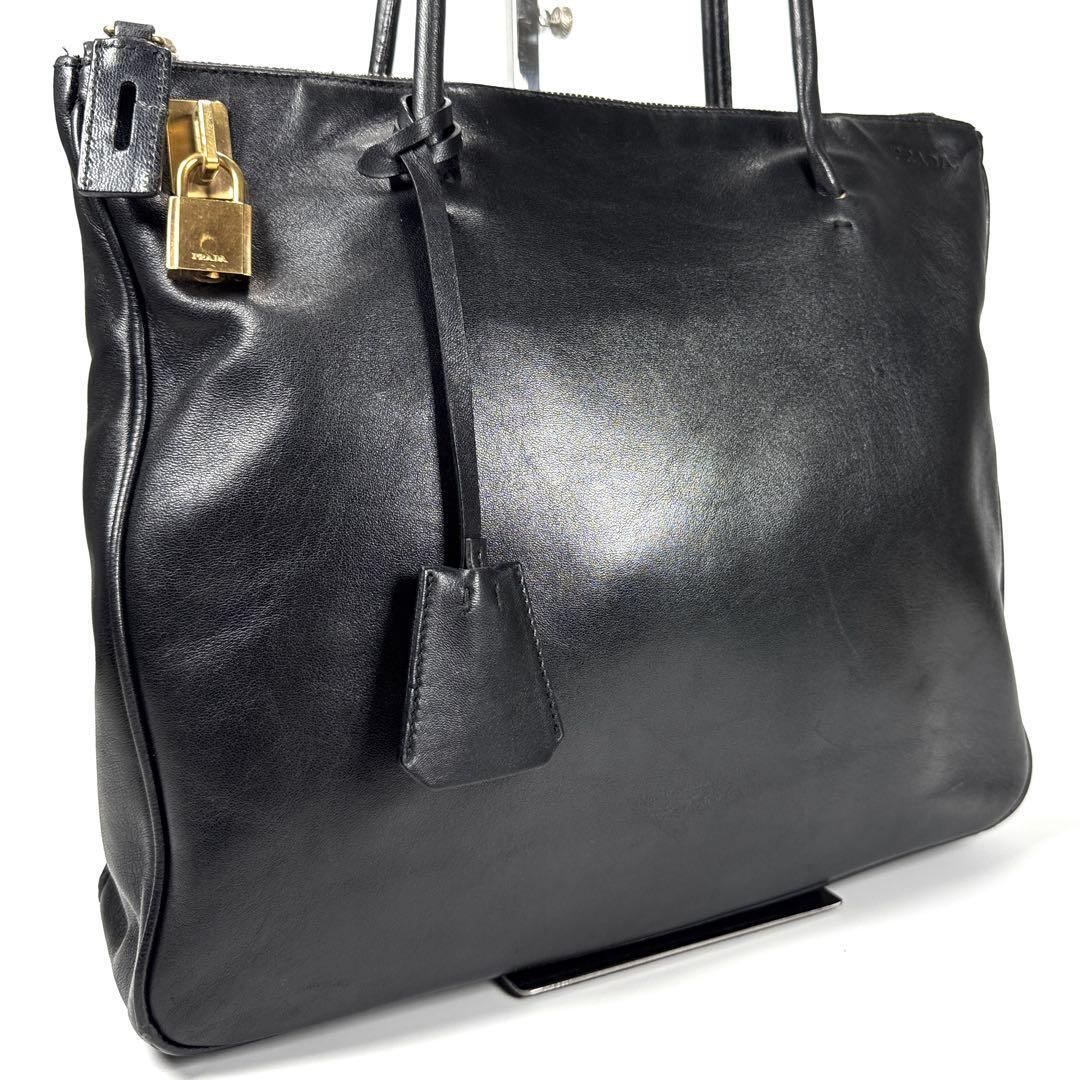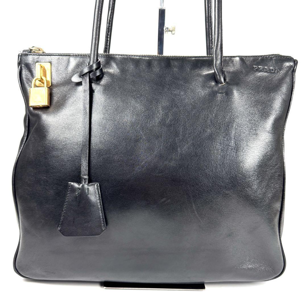 希少・レア!!! PRADA プラダ ブラックレザートートバッグ 肩掛け ロゴ型押し 南京錠 黒